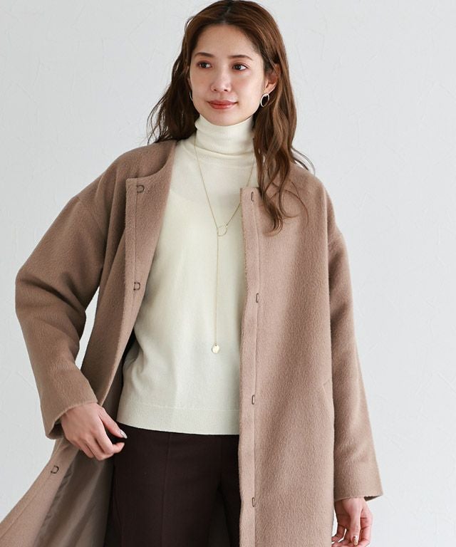 滑らかでふんわりとした肌触りが魅力のニット。3種類の繊維を混紡することで、ずっと触っていたくなるような、もっちりとした生地感に仕上げました。