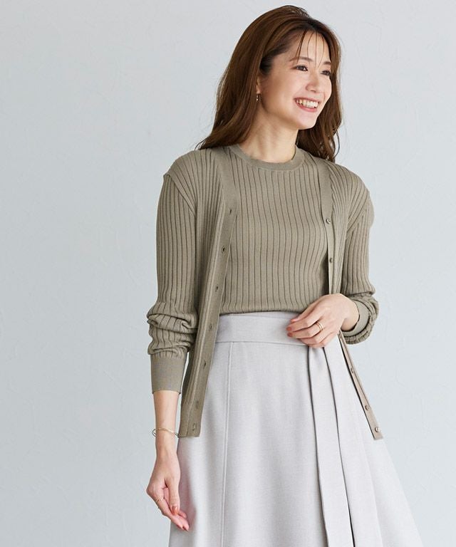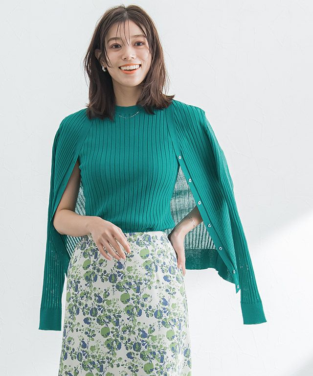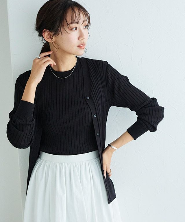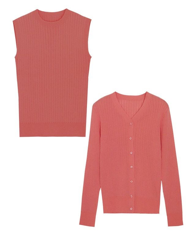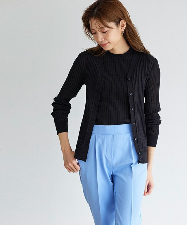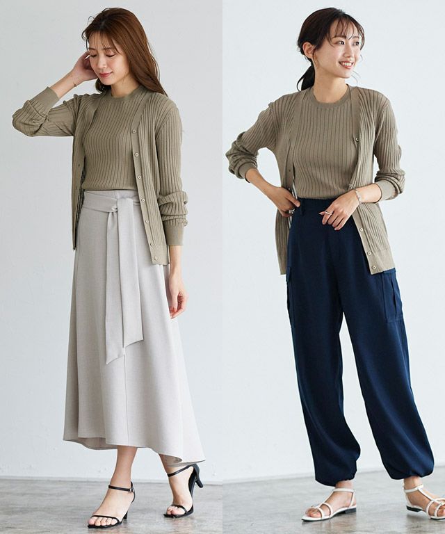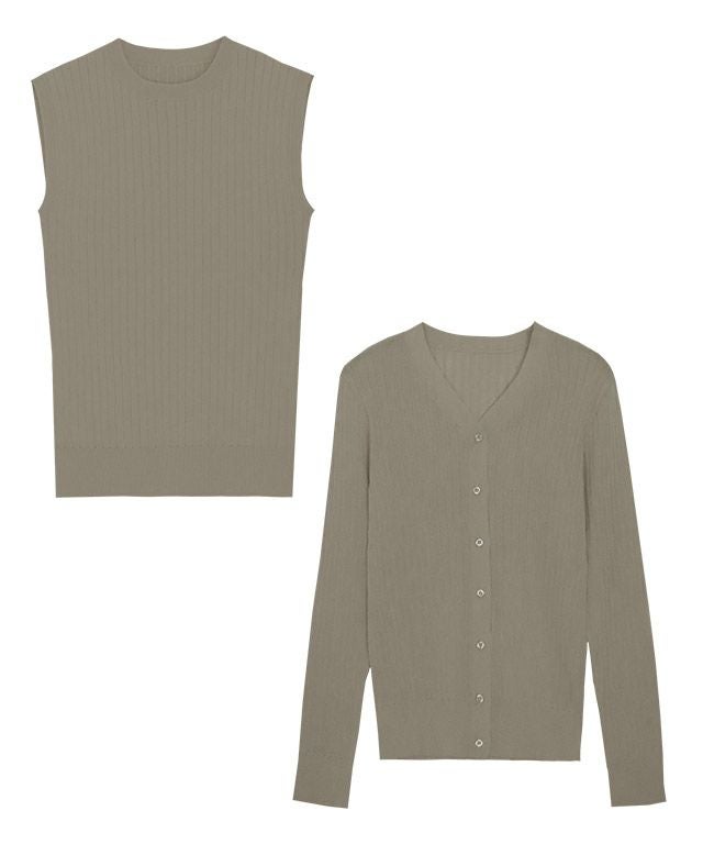 Vネックで女性らしい印象のカーディガンと、インナーに合わせてもごわつかないノースリーブニットのアンサンブル。単品使いもでき、ON/OFF問わず着回せるアイテムです◎