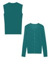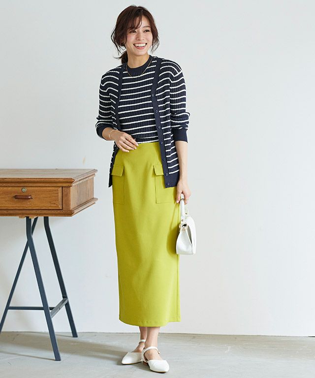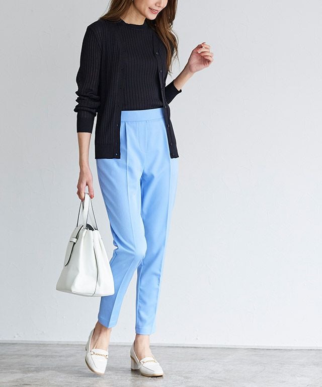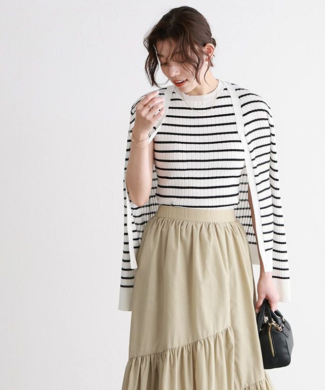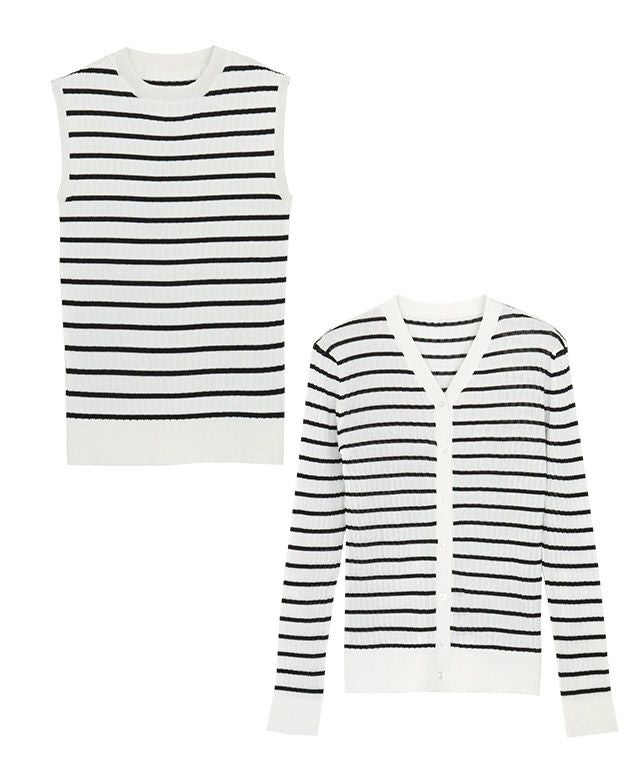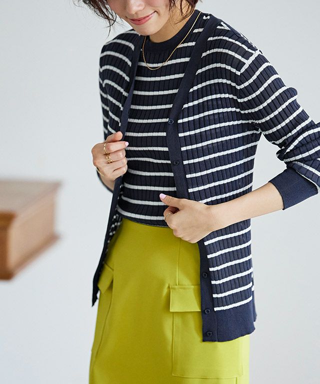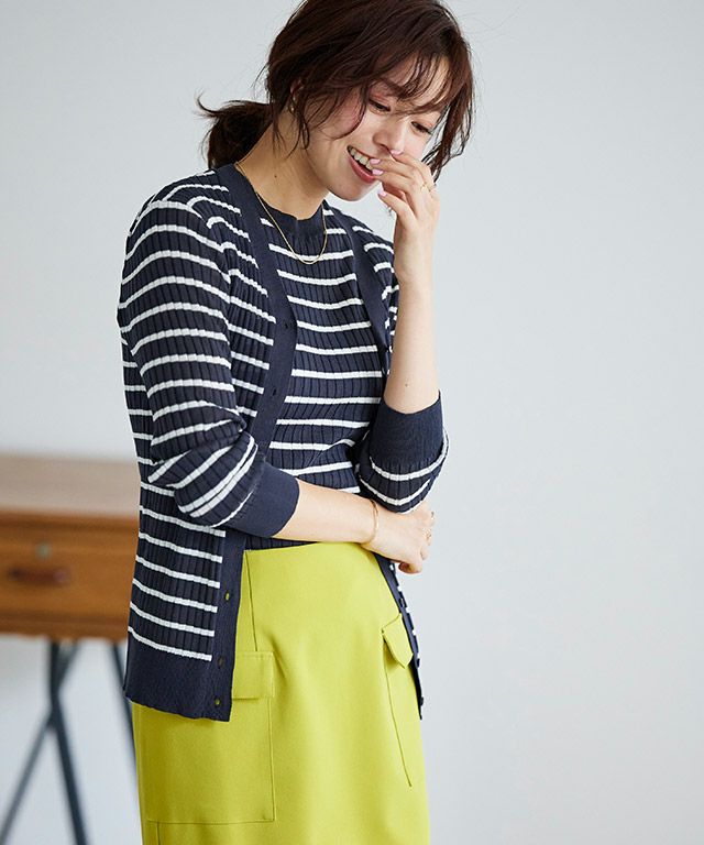 Vネックで女性らしい印象のカーディガンと、インナーに合わせてもごわつかないノースリーブニットのアンサンブル。単品使いもでき、ON/OFF問わず着回せるアイテムです◎
