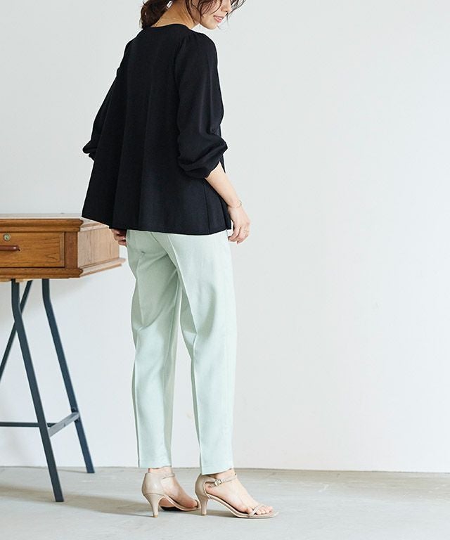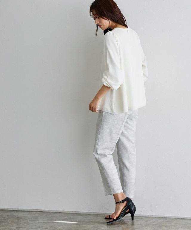もちっとした柔らかな肌触りのニット素材。上品なゴム編みできちんと感がありながらもリラクシーな着心地に。