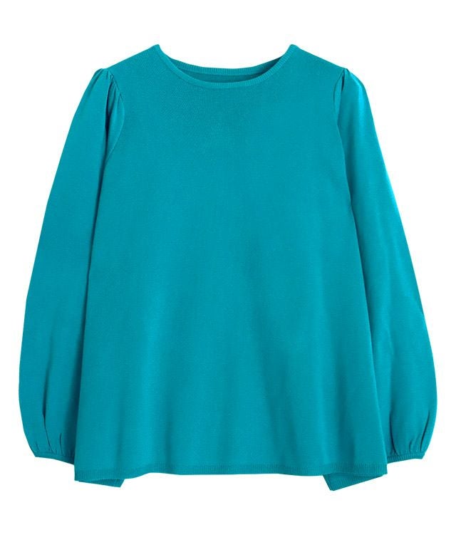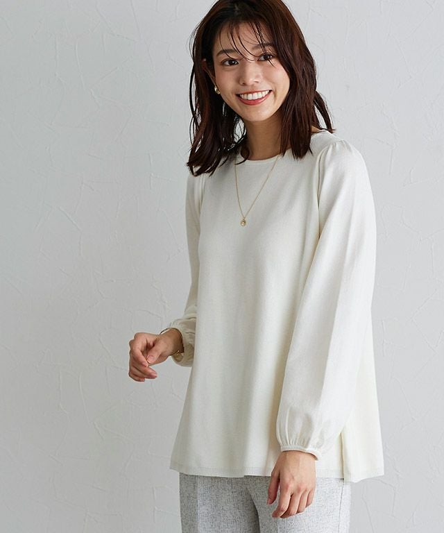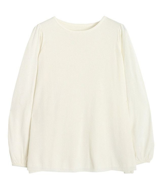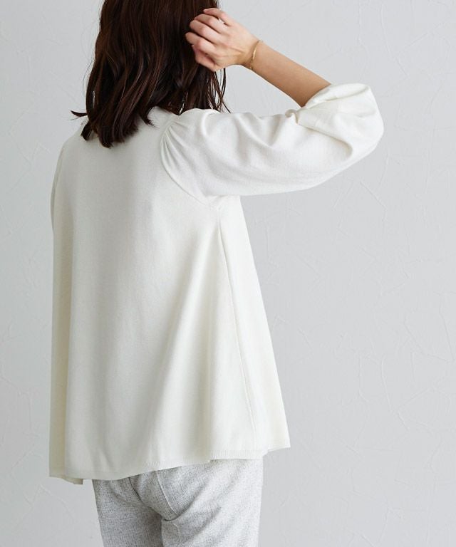 編み目の数を裾に向かって増やすことで、程よく広がるフレアラインを演出する一枚。袖にも贅沢にボリュームを持たせた女性らしいシルエットに仕上げることで、フェミニンテイストを活かしたの上品な一枚に仕上げました。