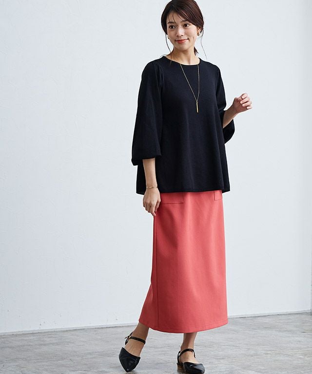 N着丈はお尻が3分の1隠れる丈感でした。袖丈は手首が少し出ます。身幅はゆとりがありました。柔らかさもあり、ややハリ感もあるので、フレアがキレイに出て、体型カバーも可能です。