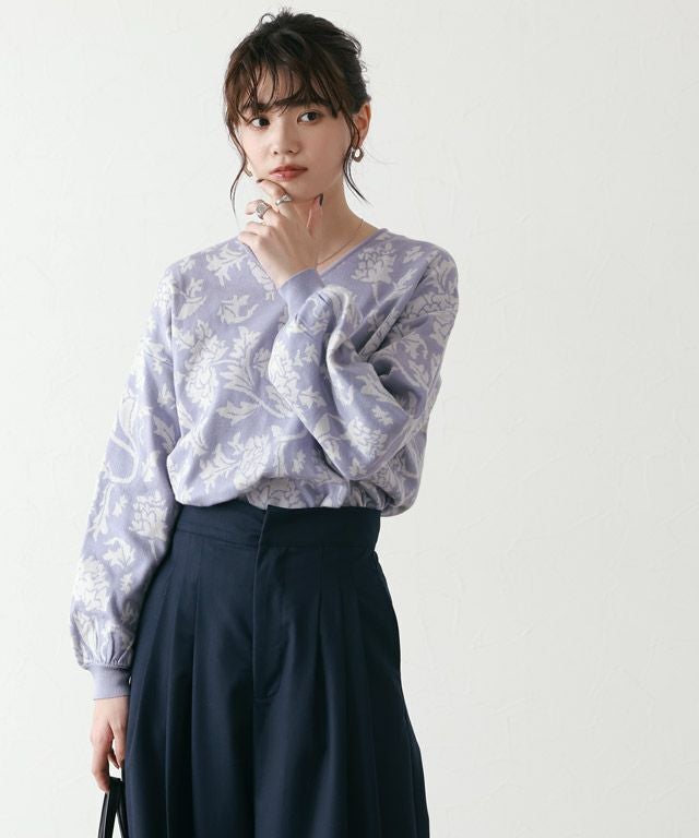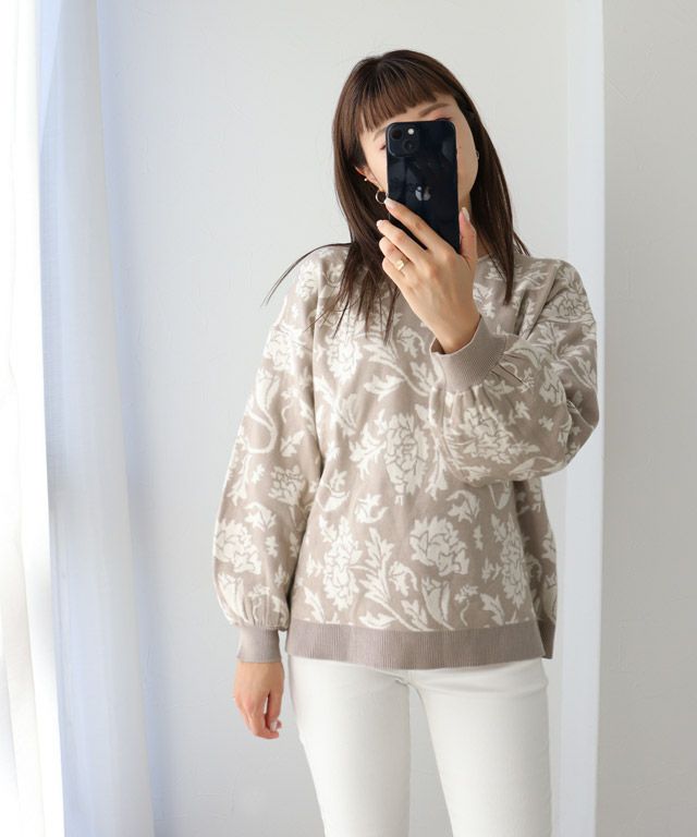一枚でしっかりと着映えるボタニカルフラワー柄を、ジャカード織で編み立てました。贅沢なボリュームスリーブが柄と相まって、レトロ感がプラスされた女性らしさを演出。