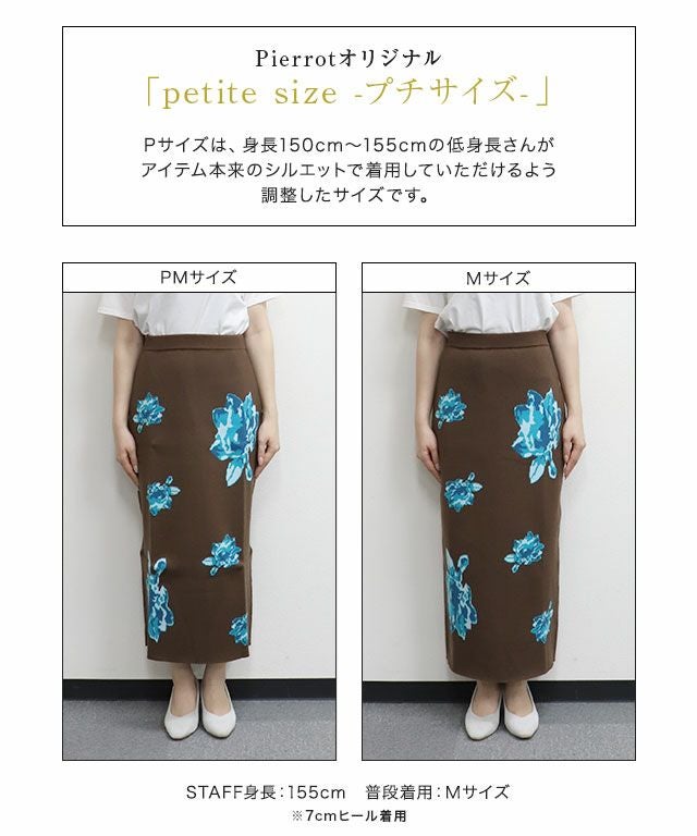 M_着丈は足首ちょうどの丈感でした。ウエストは程よくゆとりがあり、ヒップには程よいゆとりがあります。ニットなので窮屈感なく着用できます。スニーカー合わせなどの時はPMサイズを選びます。
