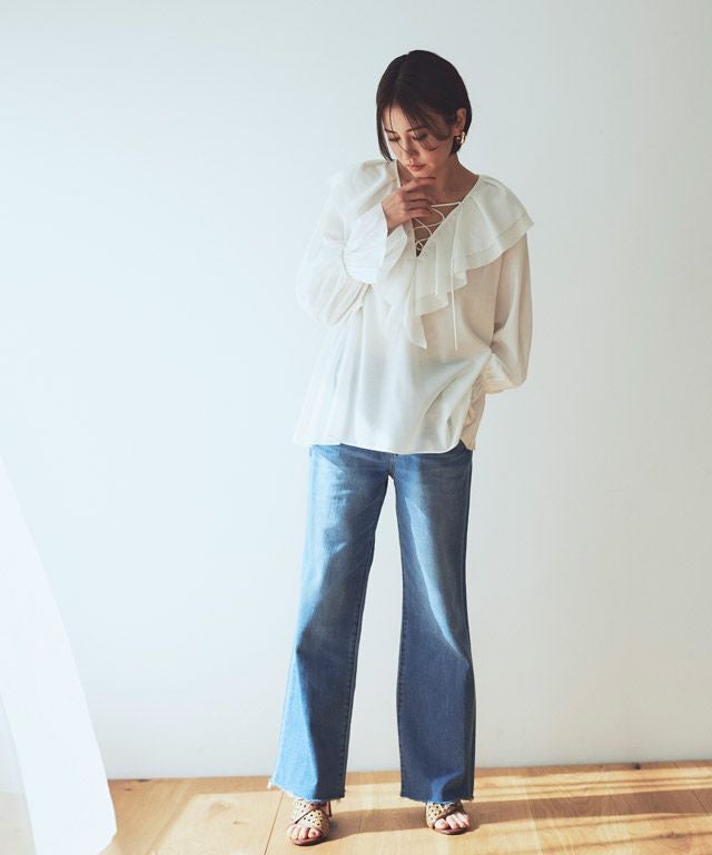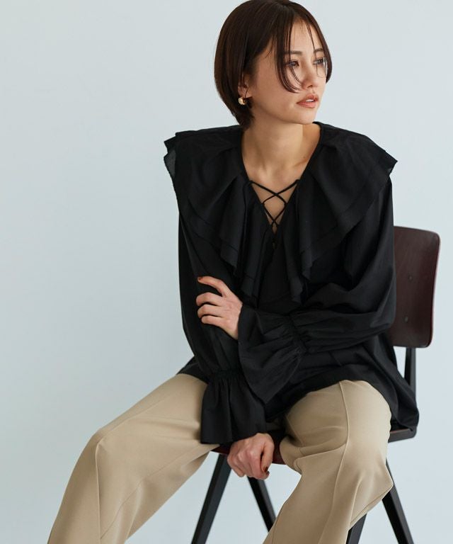 ボリュームのある二段に重なったフリルが顔周りを華やかに見せてくれる一枚。キャンディスリーブで女性らしさ溢れるデザインの中に、ざっくりと開いたvネックとレースアップのディティールが、抜け感とアクセントをプラスします。程よい透け感と相まってフェミニンになりすぎずこなれたスタイリングに仕上がります。