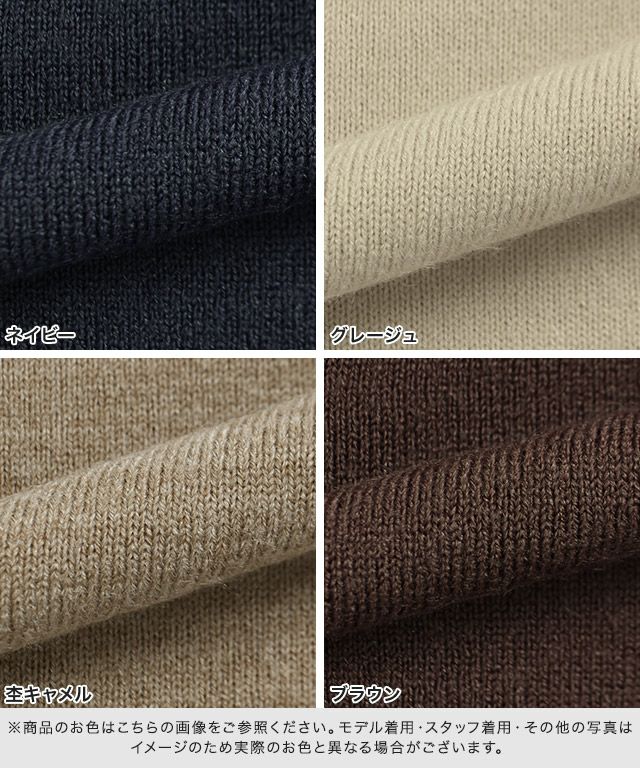 また、ニット製品は生産の過程上「生地を織る際の糸の継ぎ目」繊維の「混紡」、プレス加工、製品洗い加工によって形やサイズ(5cm前後)に誤差が生じる場合がございますが品質上の問題はございません。