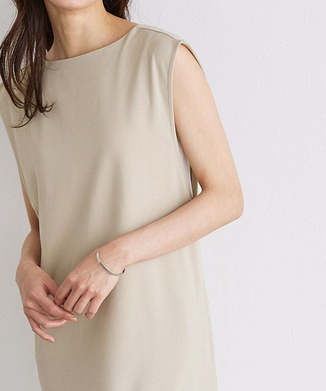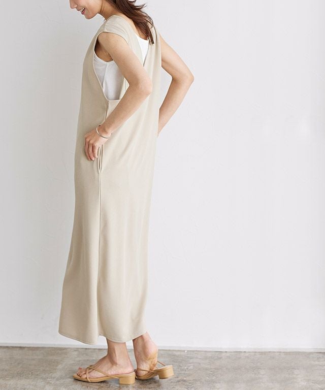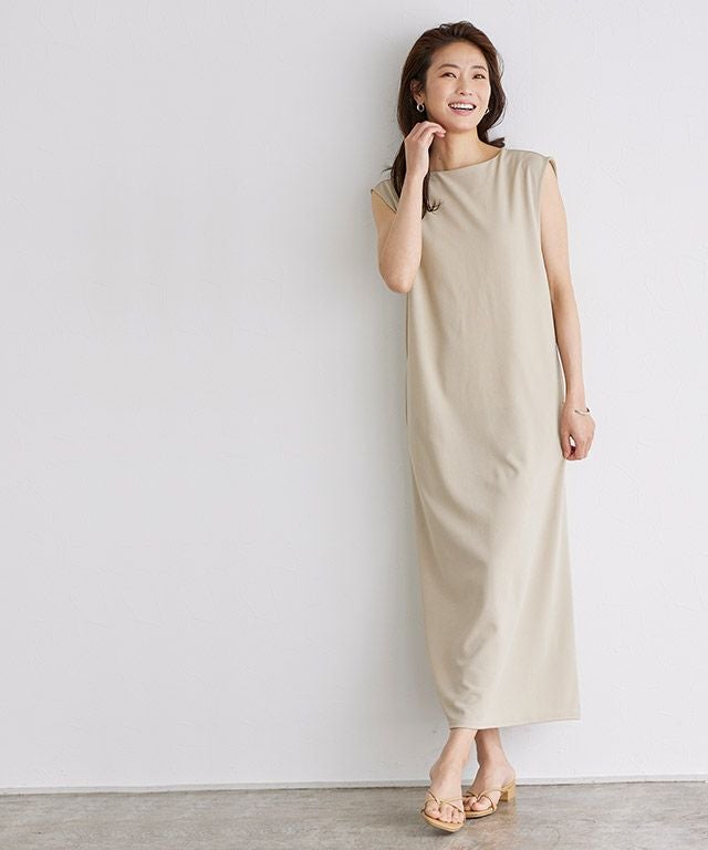 着丈は足首が少し見える丈感でした。肩がほぼ隠れるくらいのノースリーブです。脇口は広めでした。バストや太ももはややラインを拾いますが、伸縮性のある生地なので窮屈感はありませんでした。表面はややザラッとした感じですが、肌に触れる裏面はつるっとしており、着心地が良いです。