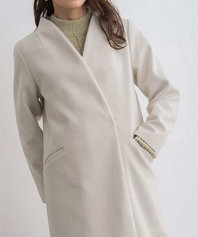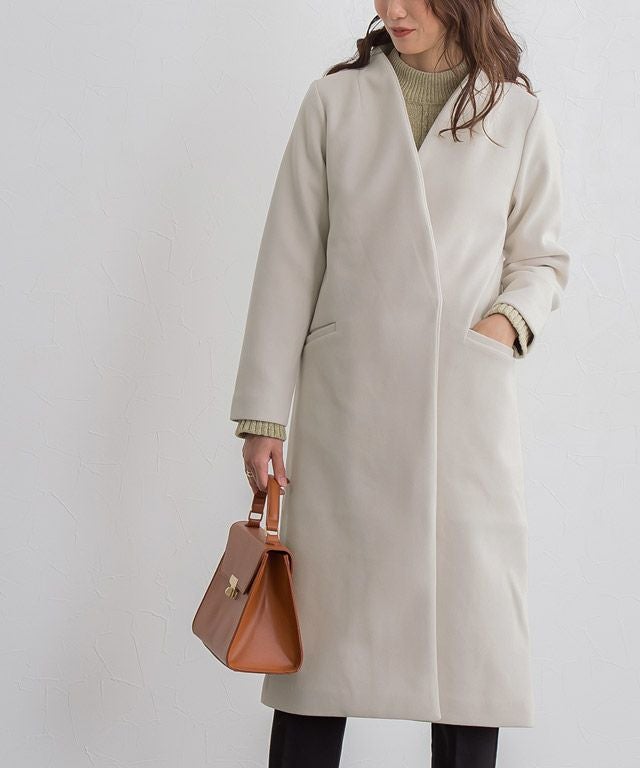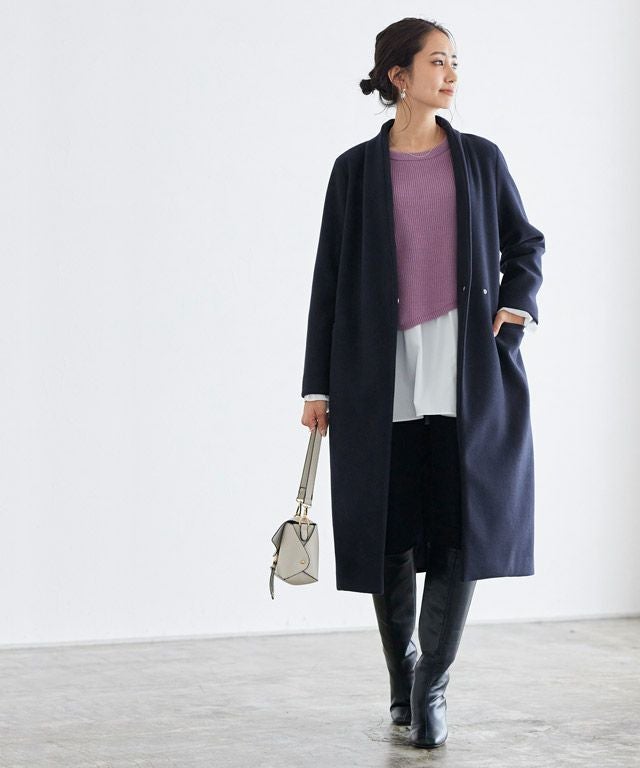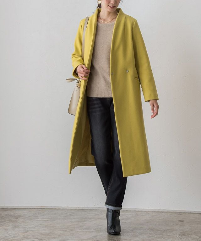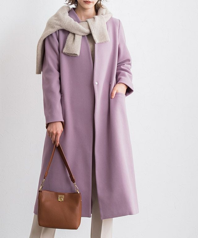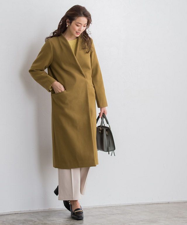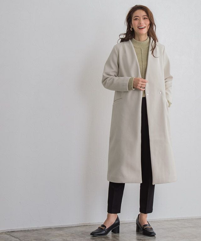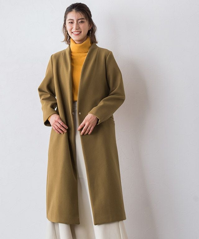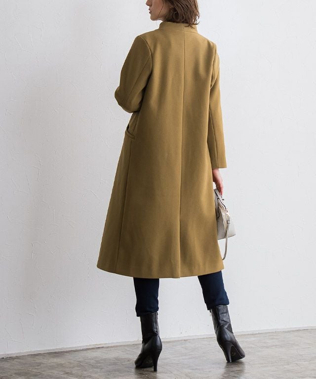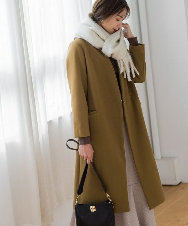 シンプルなディテール使いが上品な印象漂う“メルトンノーカラーコート”