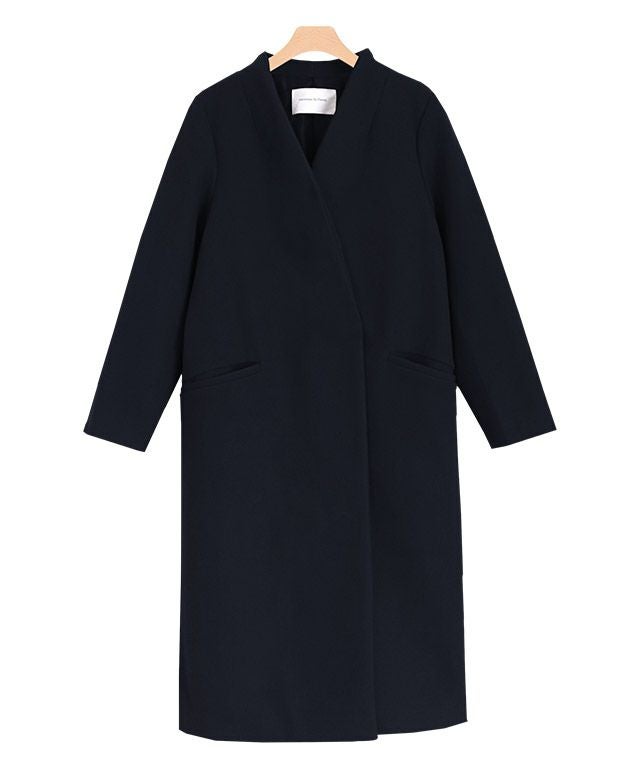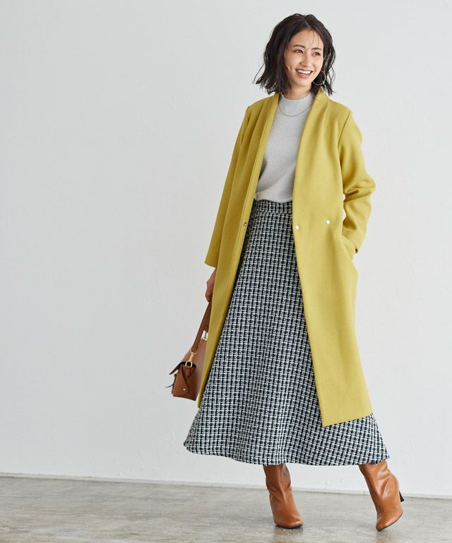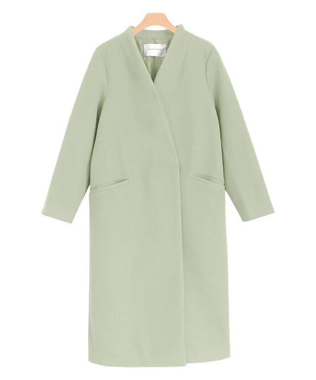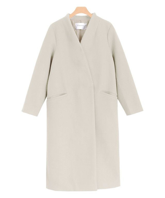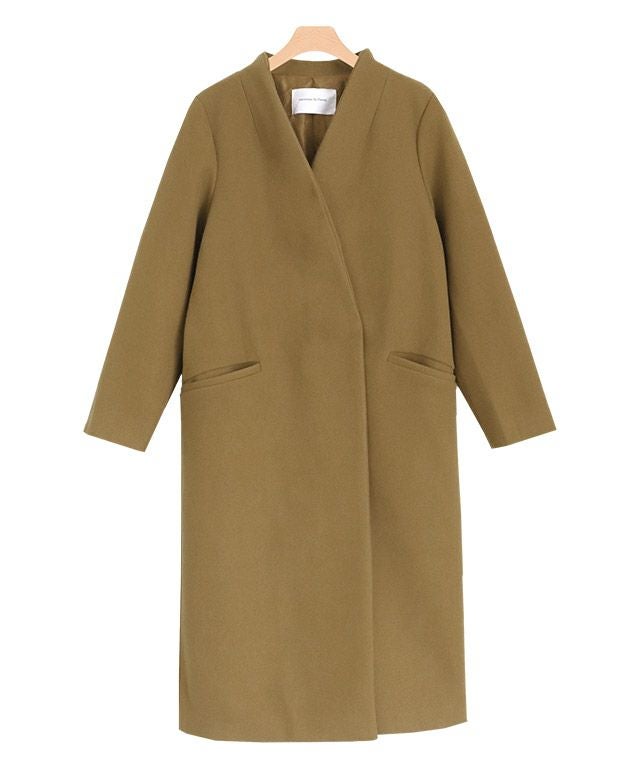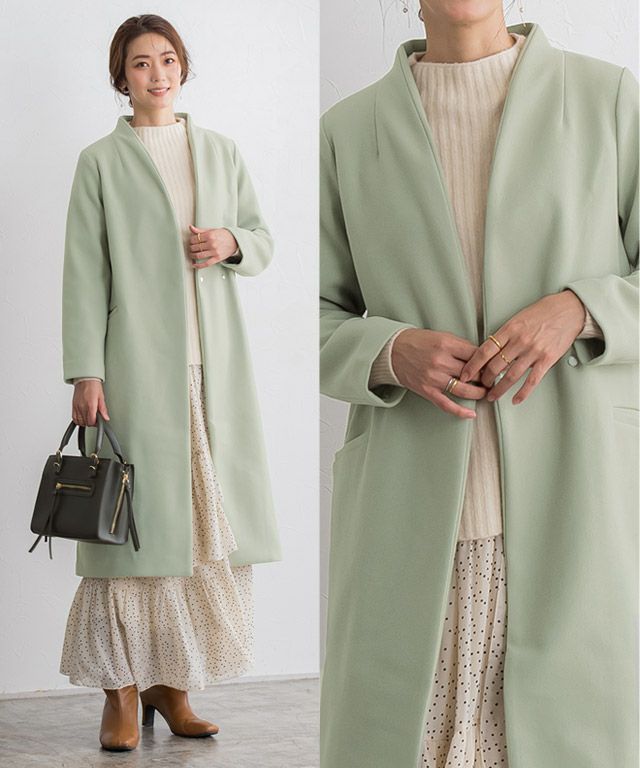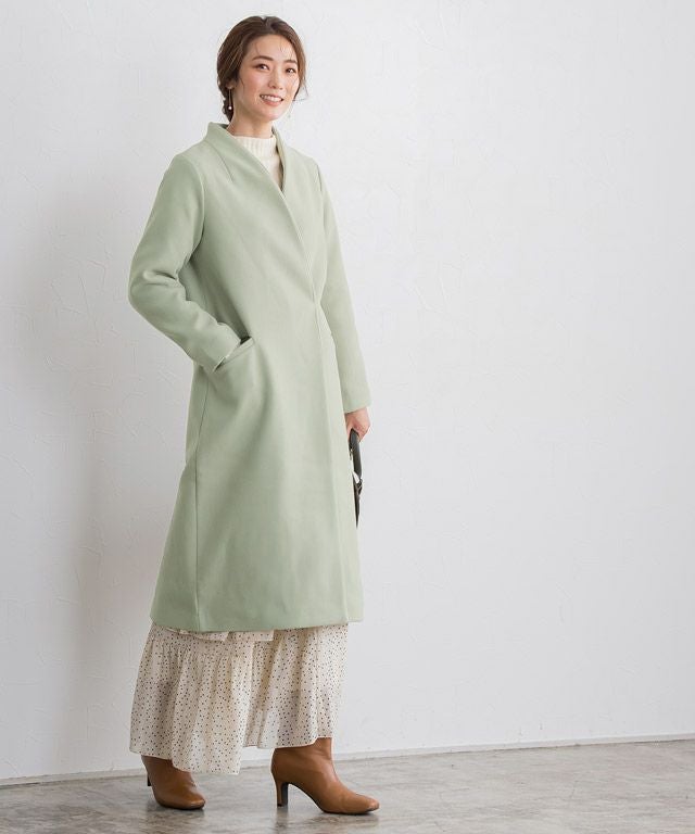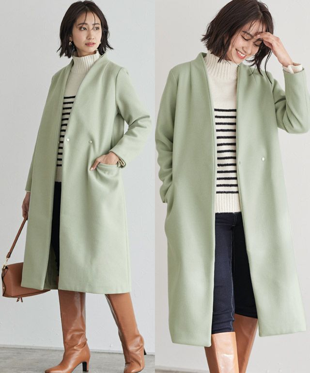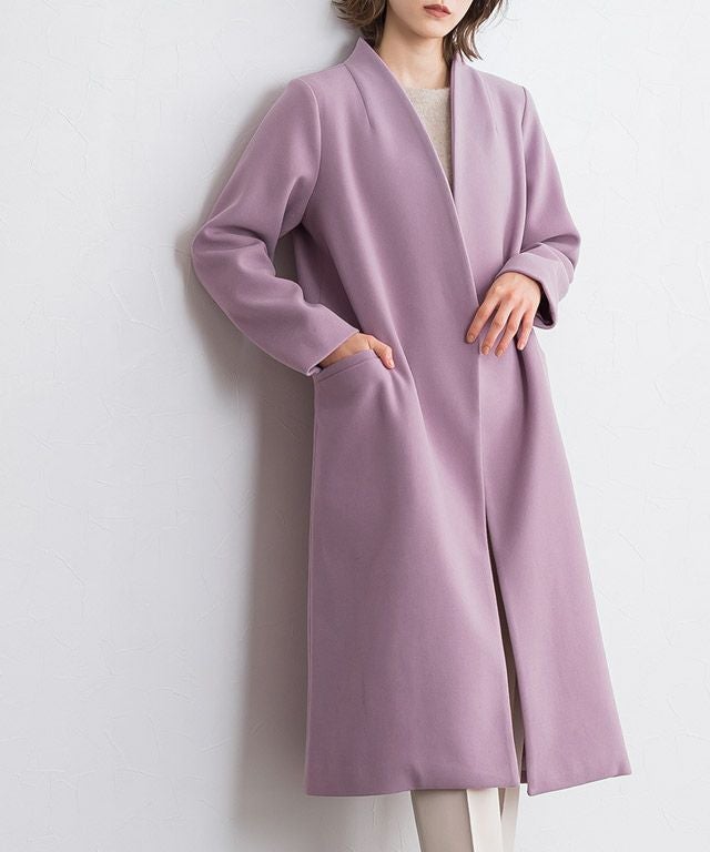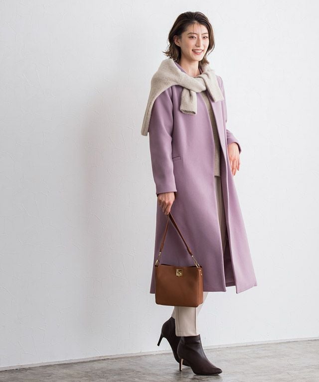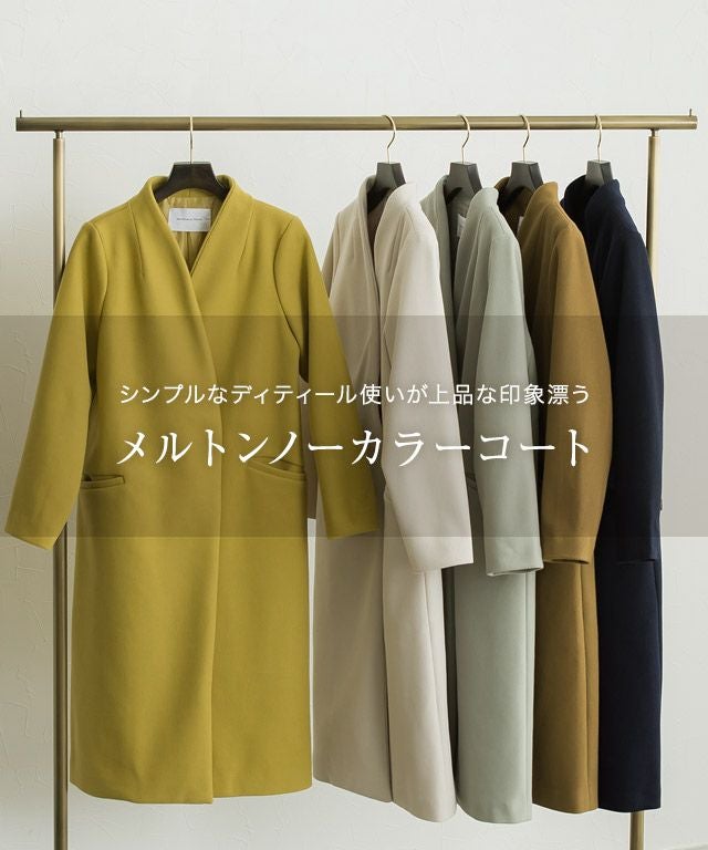 シンプルなディテール使いが上品な印象漂う“メルトンノーカラーコート”