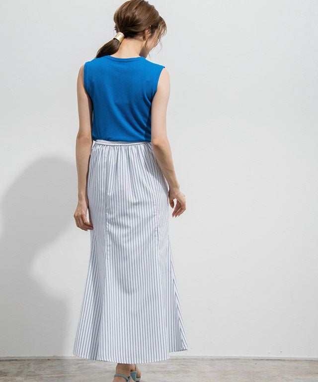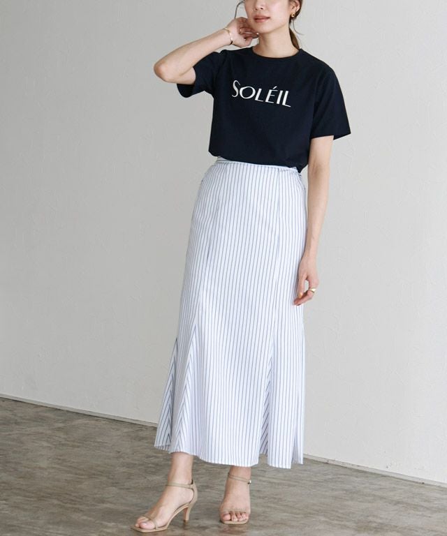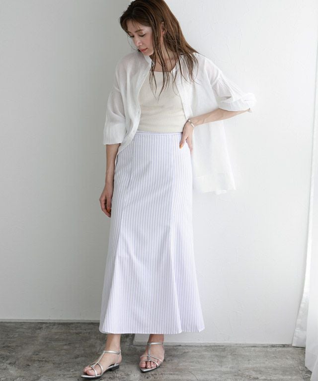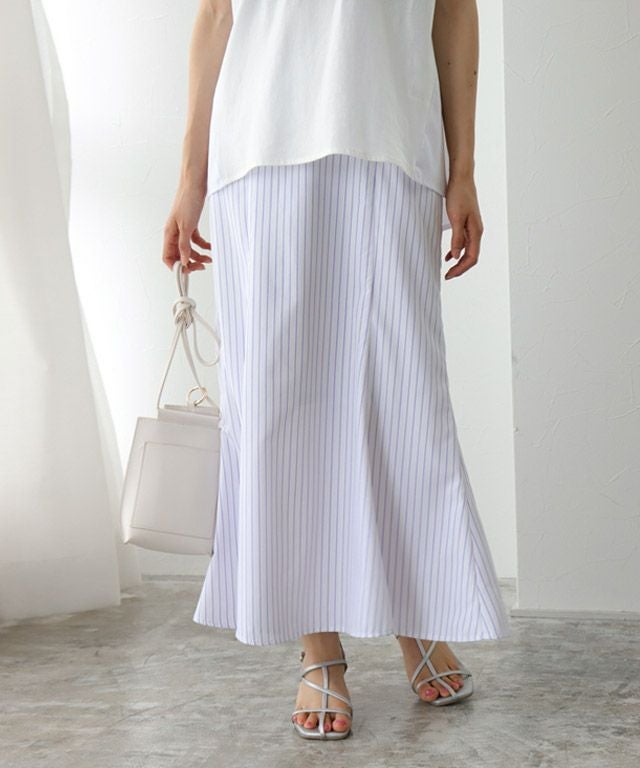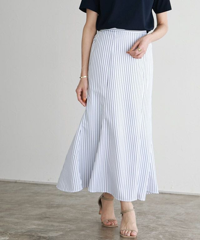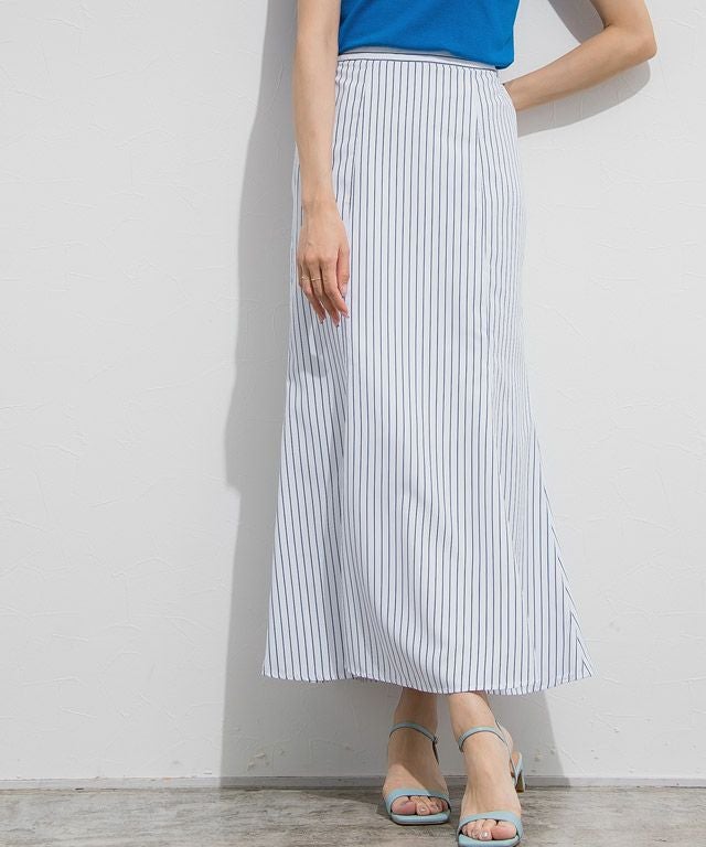 シーズンムード漂う“ストライプ切り替えマーメイドスカート” レーヨン混の柔らかい素材が魅力的で、ストライプ柄がシーズンムード高め、涼し気な印象に。切り替えを施すことでふんわりとしたシルエットを演出し、女性らしく一枚でこなれ感のある装いに導いてくれます◎ 【ブランド】Pierrot(ピエロ)