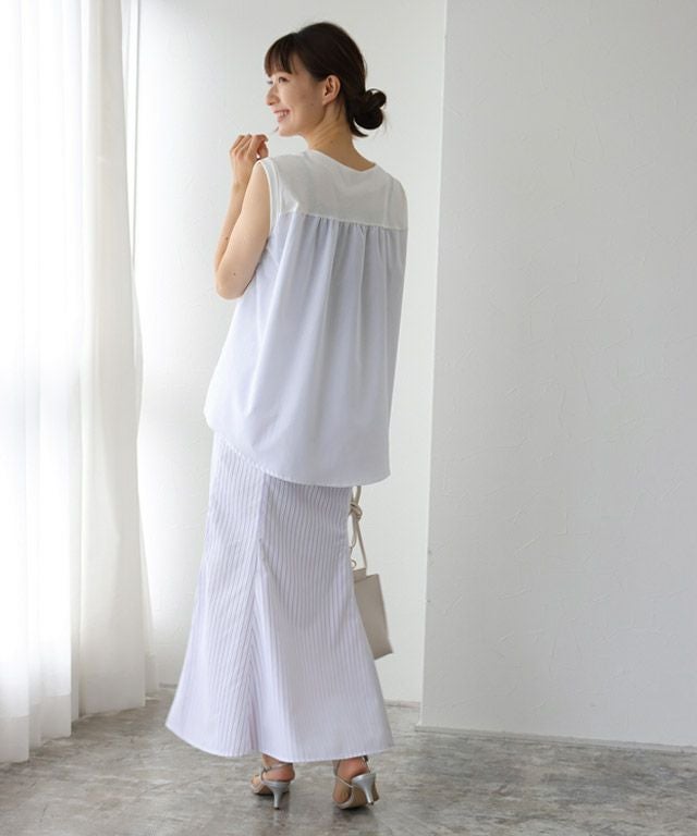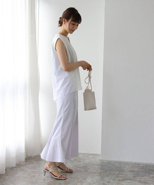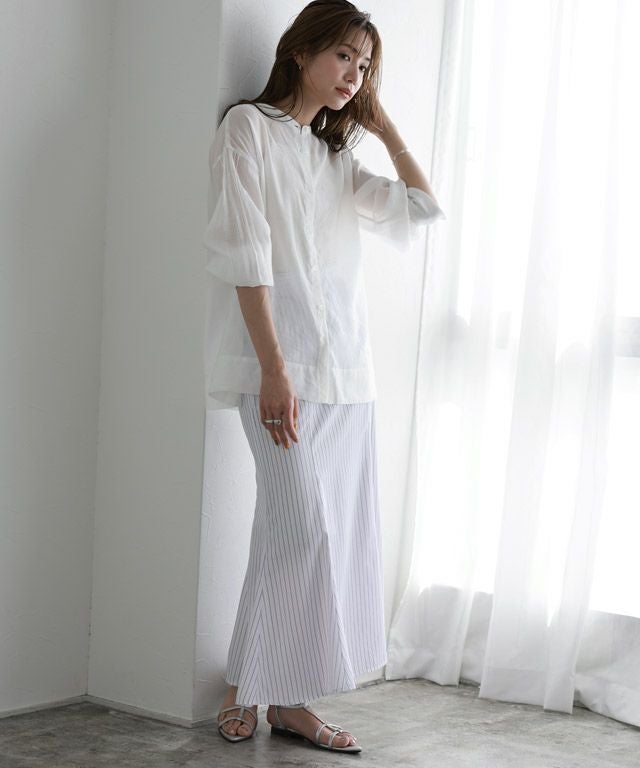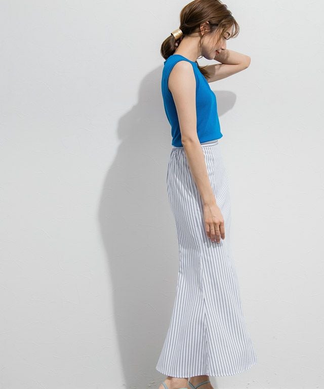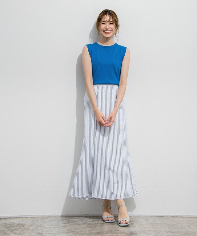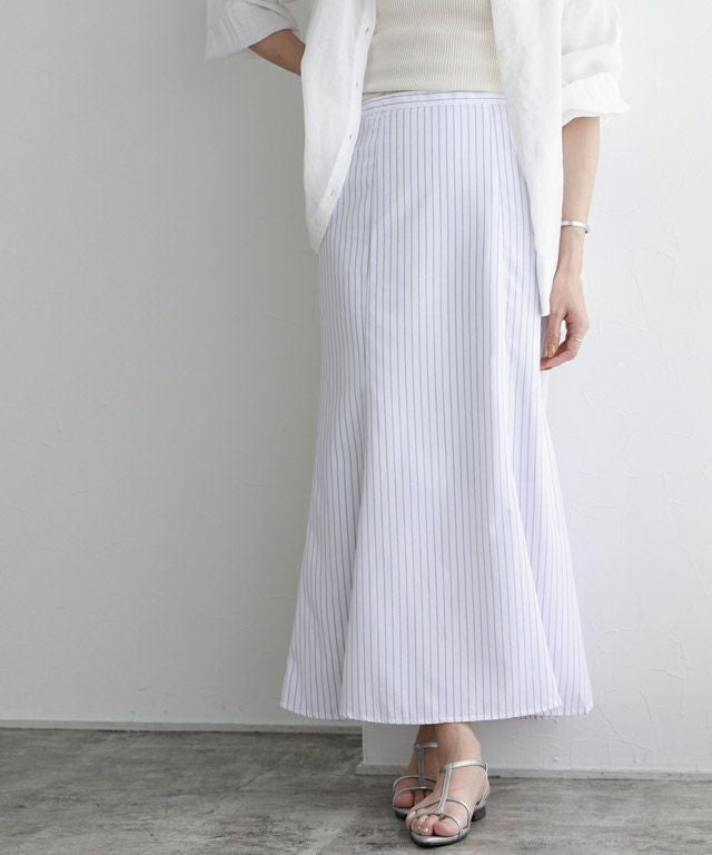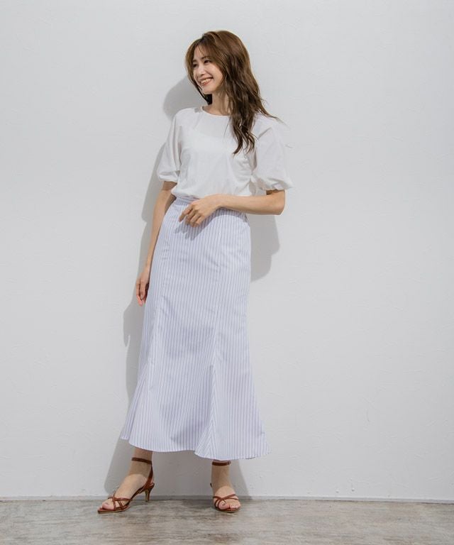 シーズンムード漂う“ストライプ切り替えマーメイドスカート” レーヨン混の柔らかい素材が魅力的で、ストライプ柄がシーズンムード高め、涼し気な印象に。切り替えを施すことでふんわりとしたシルエットを演出し、女性らしく一枚でこなれ感のある装いに導いてくれます◎ 【ブランド】Pierrot(ピエロ)