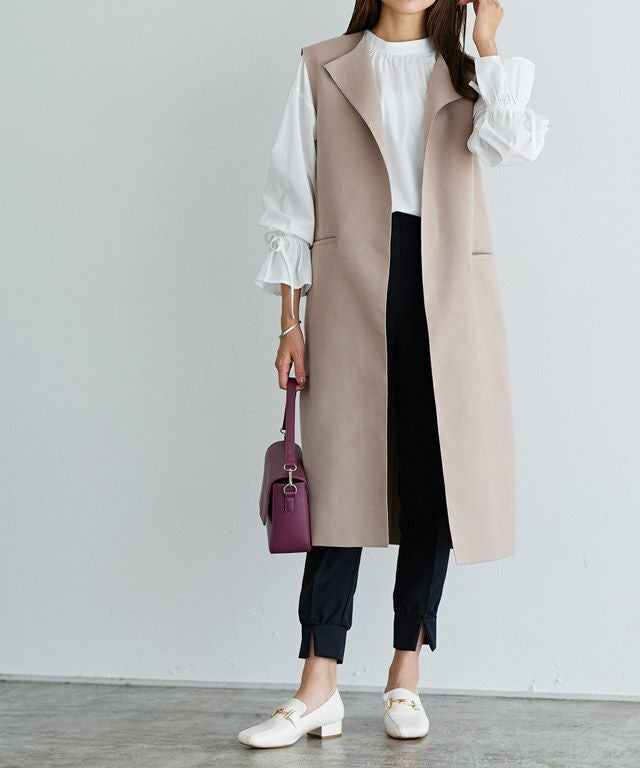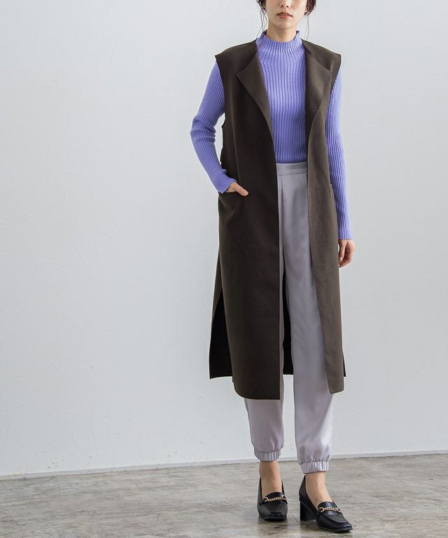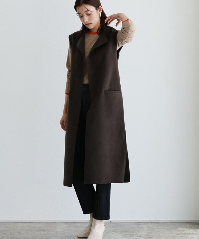 スッキリ見えするIラインシルエットで大人な印象のロングジレ。サイドにスリットを入れ、抜け感をプラスしました。ノーカラーがインナーを選ばず合わせやすく、女性らしい印象に。ベルトでスタイリングに変化も付けられるアイテムです。