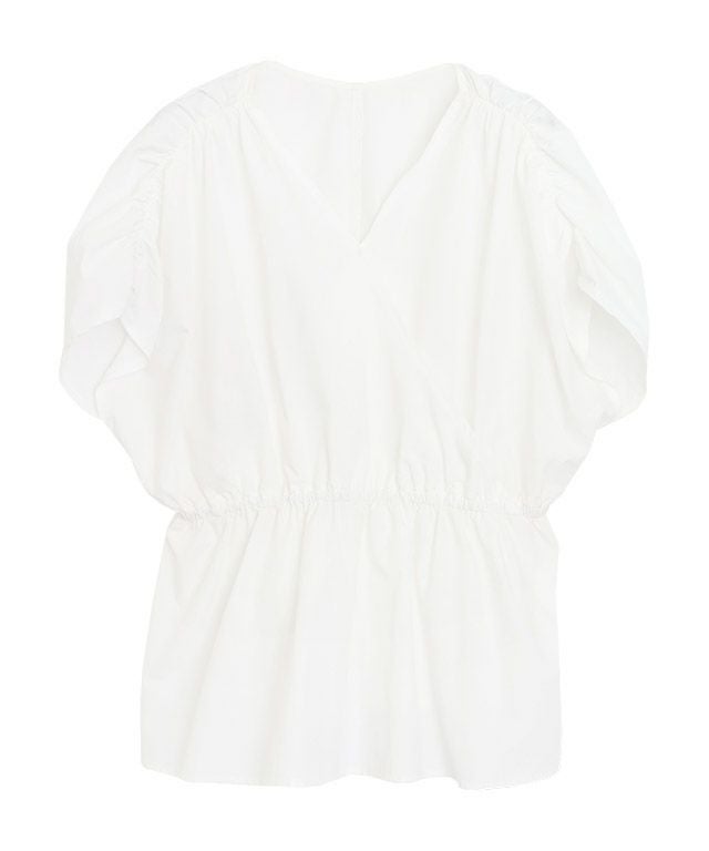 デコルテ回りを綺麗に見せてくれるカシュクールデザイン。ウエストのペプラムディテールは体型カバーしつつフェミニンな印象をプラス。一枚で着映えるブラウスに仕上げました。