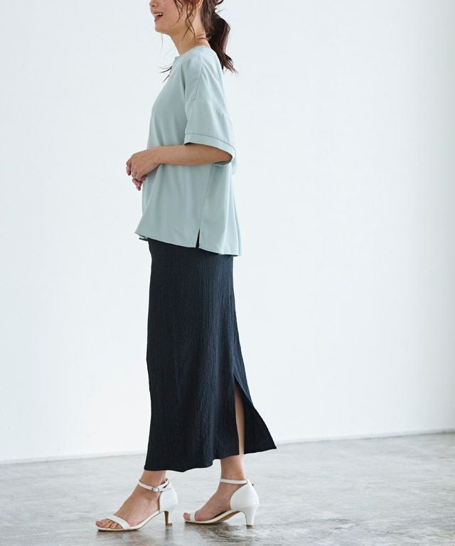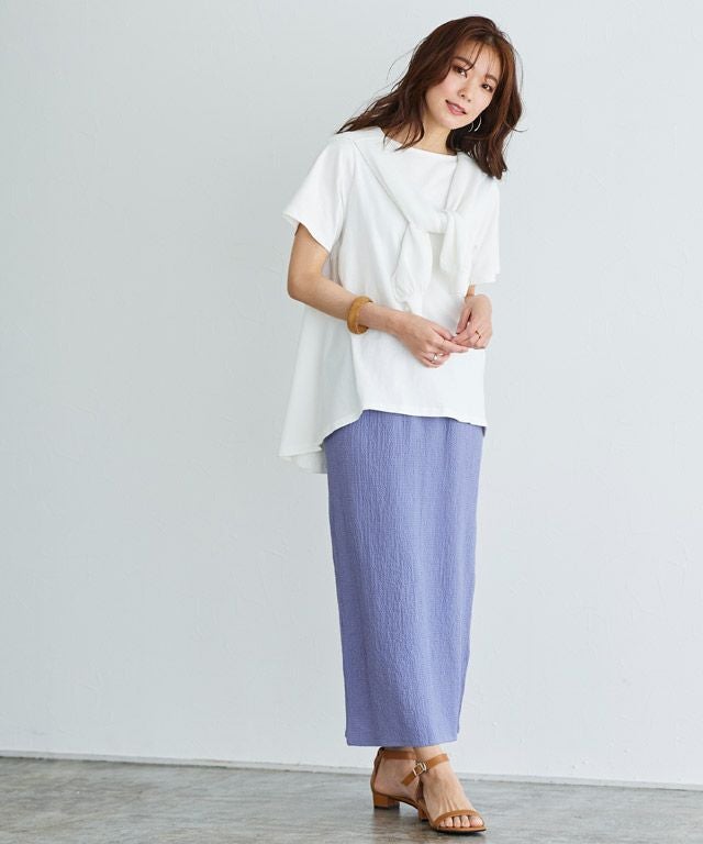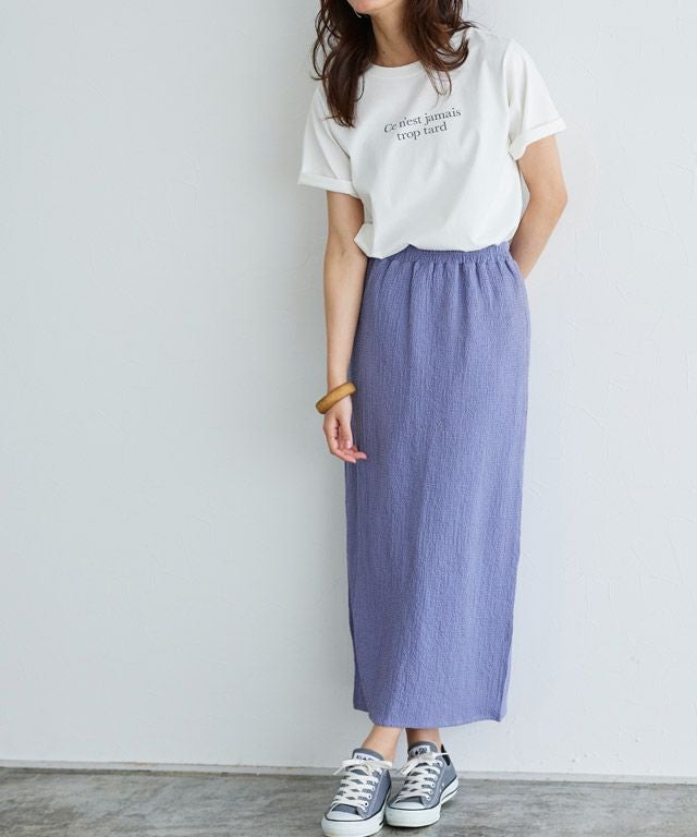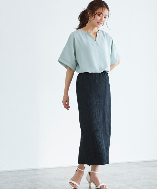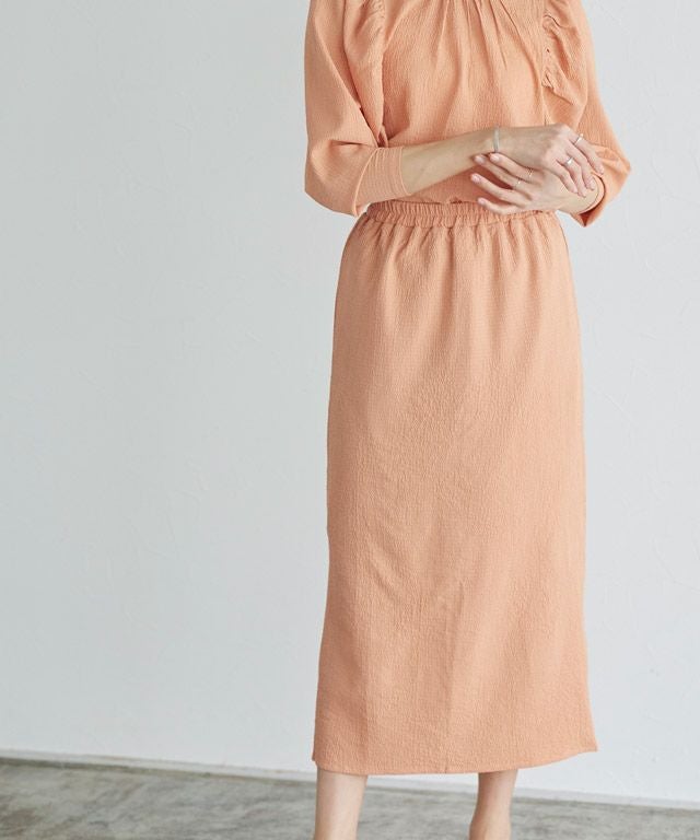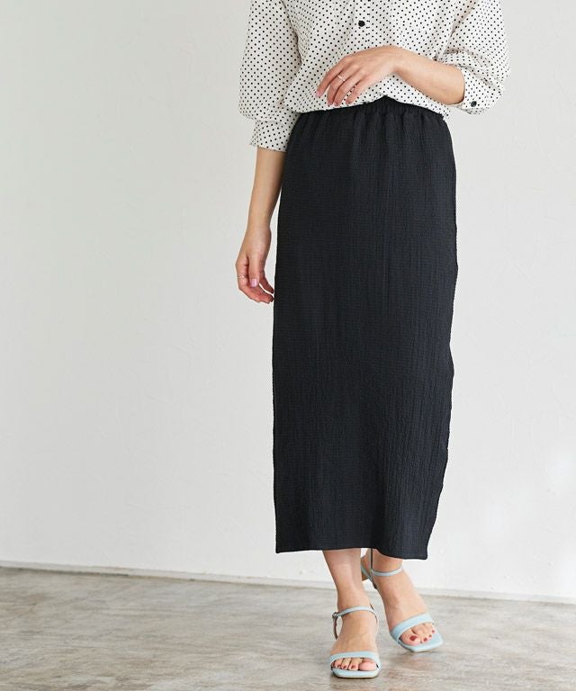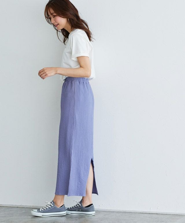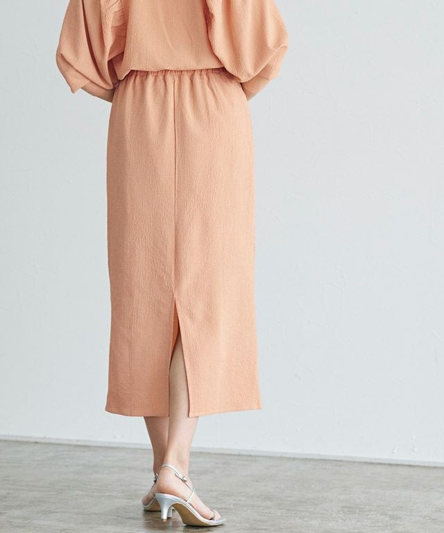 M 着丈は足首よりも少し上の丈感でした。Iラインのすっきりとしたシルエットですが、ウエスト部分がゴム仕様になっており、窮屈感はありません。深めのバックスリットが女性らしさを演出してくれます。裏地がひざ上辺りまであるので透ける心配もありませんでした。生地はシボ感がある素材でした。