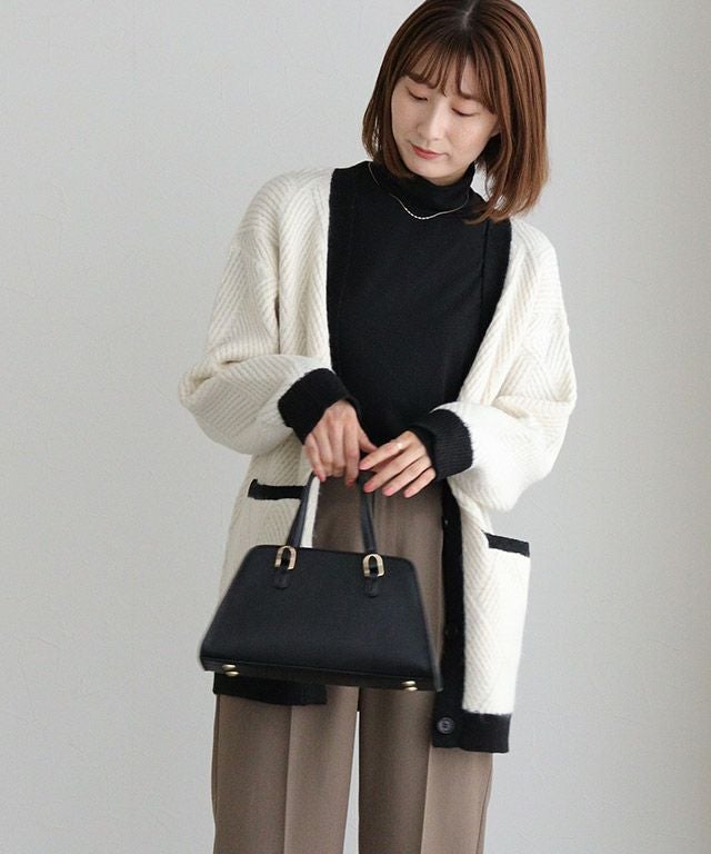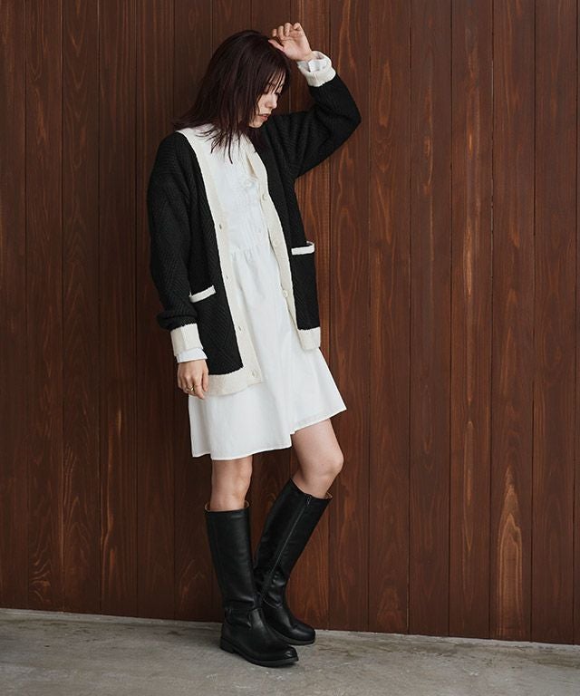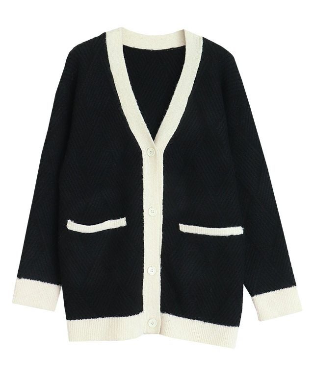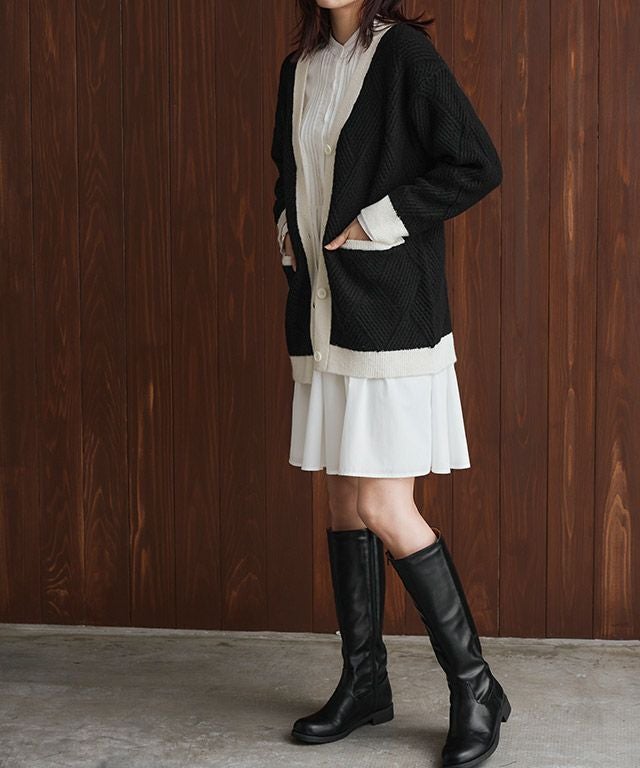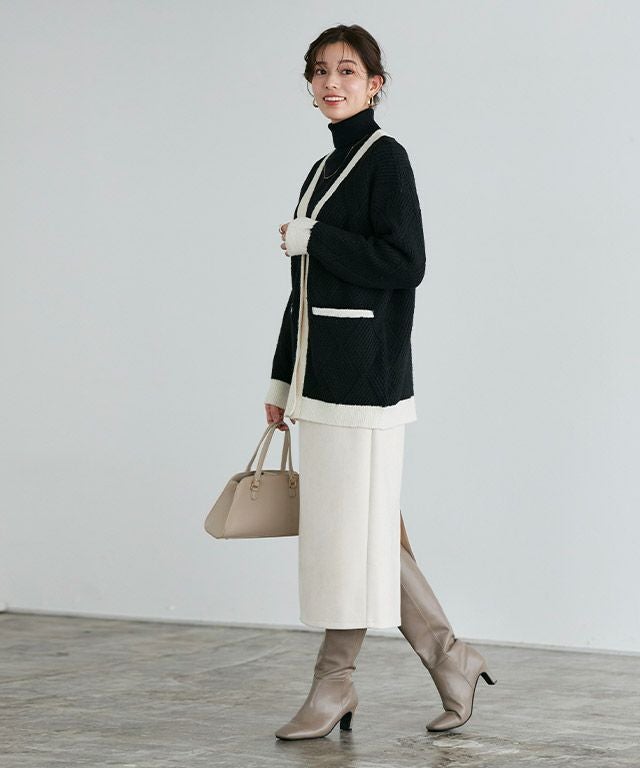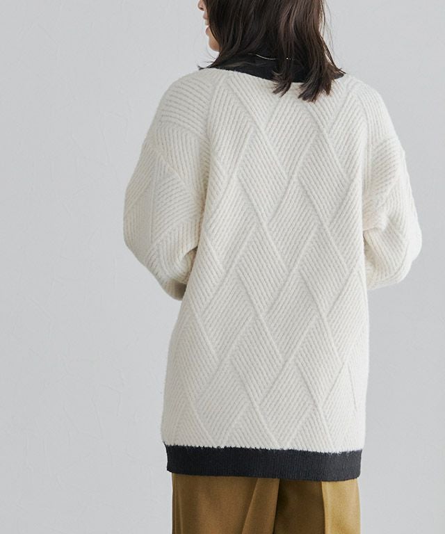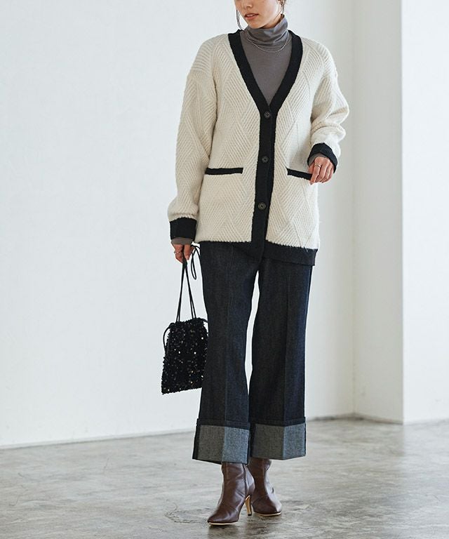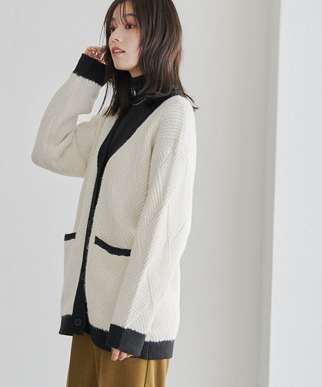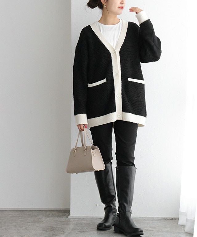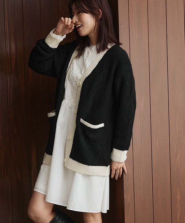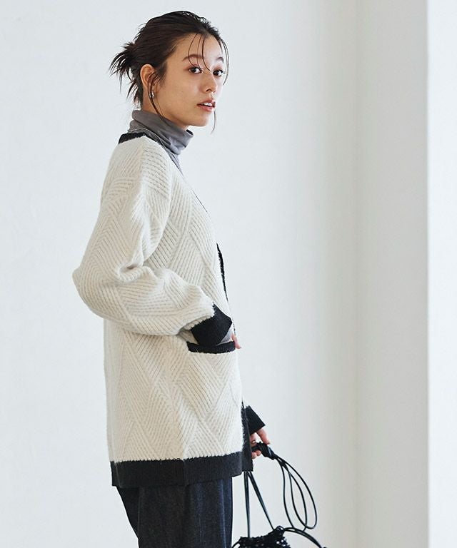 バイカラーで華やかな印象に“ダイヤ柄配色カーディガン”
