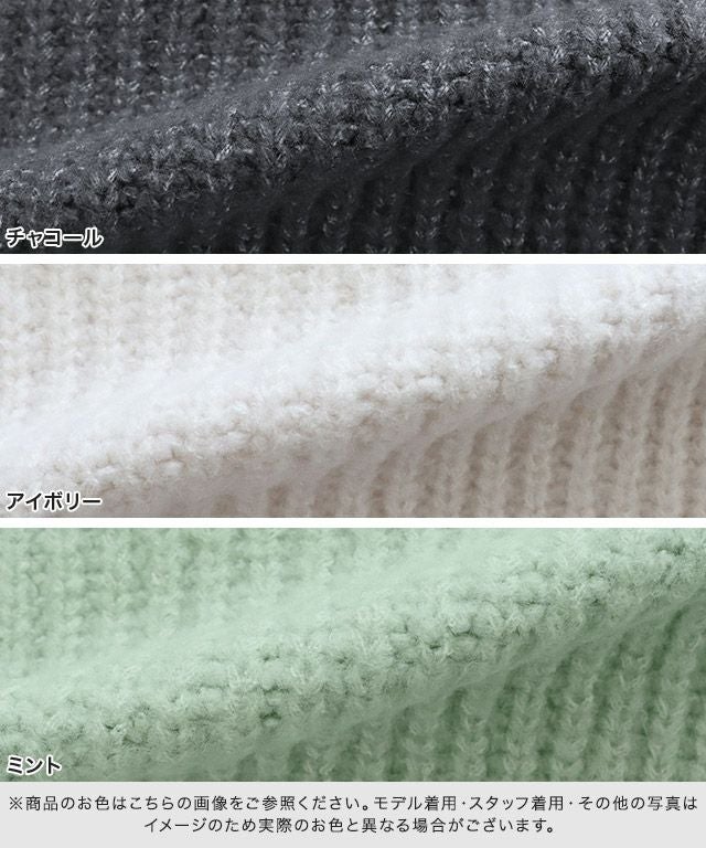 また、ニット製品は生産の過程上「生地を織る際の糸の継ぎ目」繊維の「混紡」、プレス加工、製品洗い加工によって形やサイズ(5cm前後)に誤差が生じる場合がございますが品質上の問題はございません。