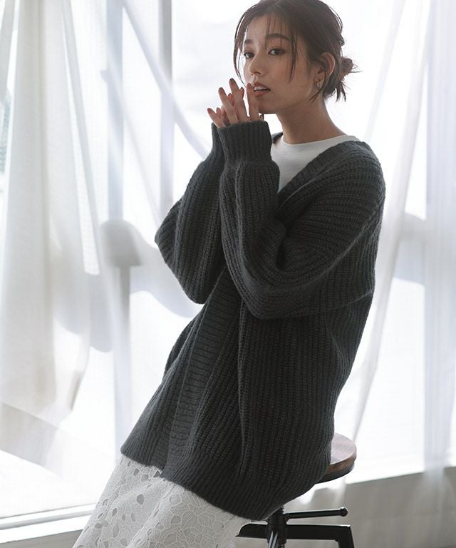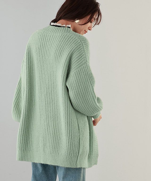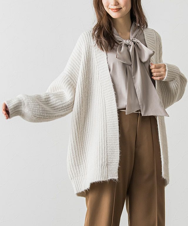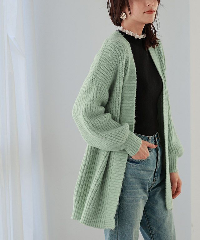 ヒップまで隠れるオーバーシルエットがざっくりとルーズな印象に仕上げてくれるカーディガン。ボリューム袖で女性らしさをプラスしました。細身のボトムスにはもちろん、スカートやワイドパンツなどと合わせたルーズなスタイリングもおすすめです。
