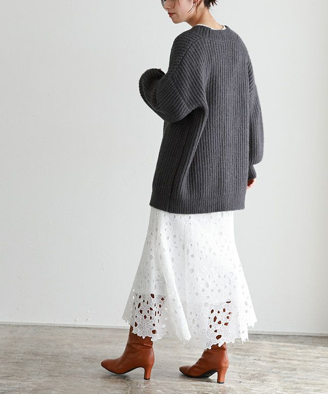 ふわっと柔らかく優しい肌触りで、重すぎない着心地に仕上げました。ローゲージで編むことでざっくりした編地がアクセントになる一枚です。