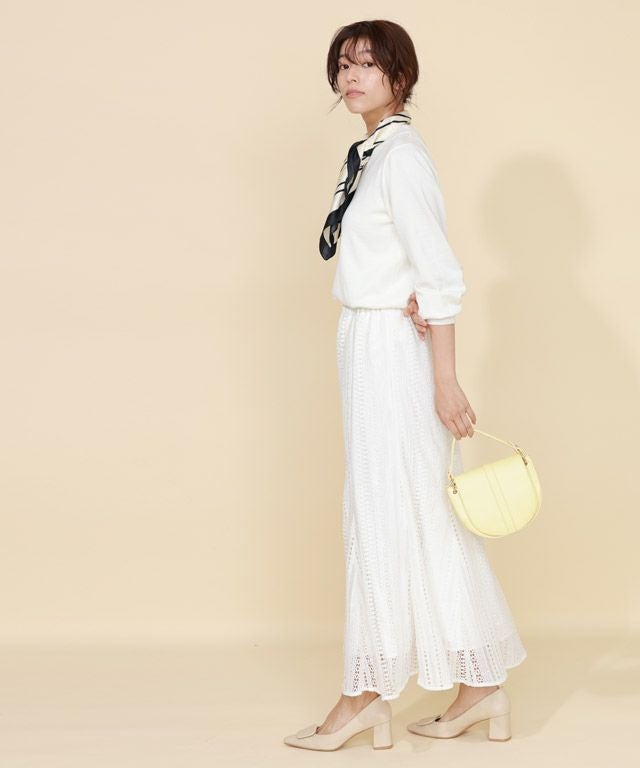 スカーフが大人っぽいスタイリングに仕上げるニットセットアイテムです。シャープなラインがアクセントになったスカーフは、上品ですっきりとした印象に。ニットは単体でも使いやすいシンプルなデザインで、デイリー使いにも最適。シーンやコーディネートに合わせてアレンジが楽しめる一枚です。