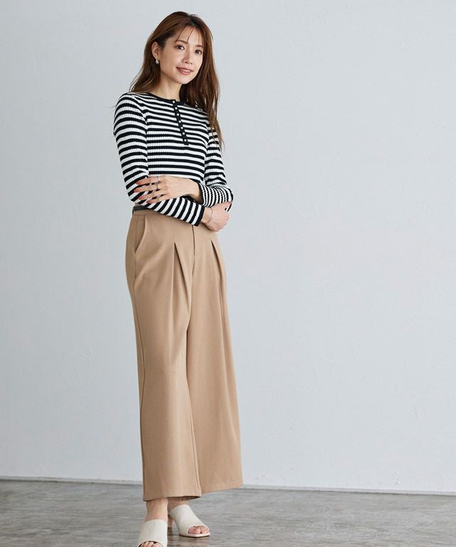 レーヨン混の柔らかさとポリエステルの程良いハリ感でさらりとした肌触りが魅力的。リブ編みにすることでスタイリングに表情をプラスしてくれます。