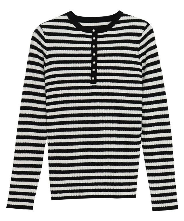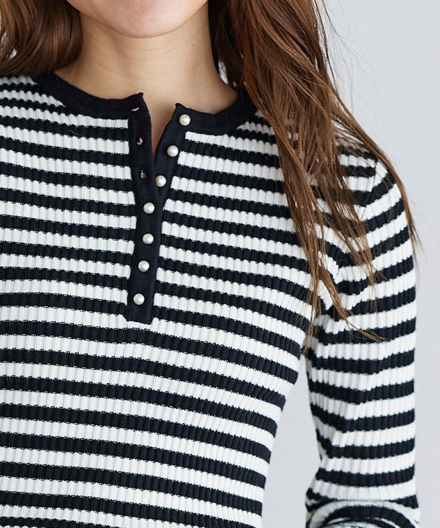 カジュアルな印象のヘンリーネックもパールボタンにすることで女性らしさをプラスさせた一枚。ボタンを何個か開けて抜け感のある印象にすることもおすすめです。