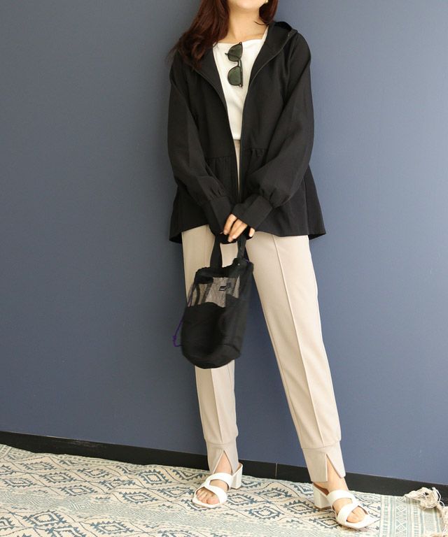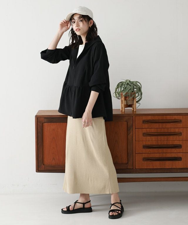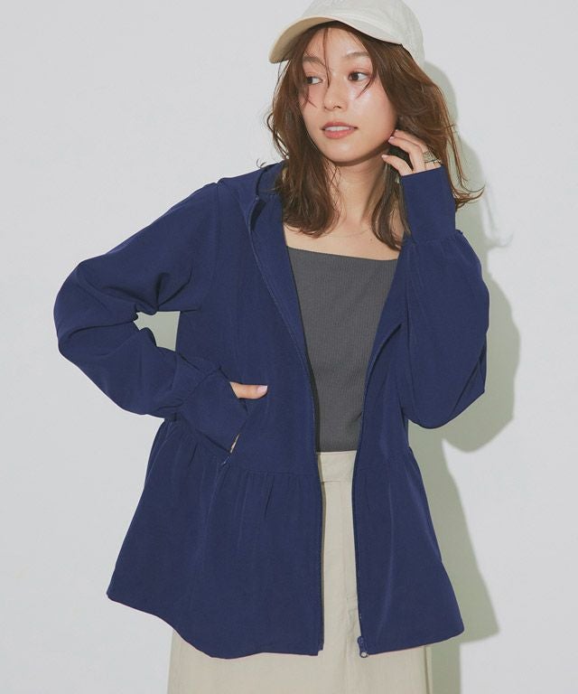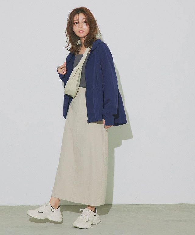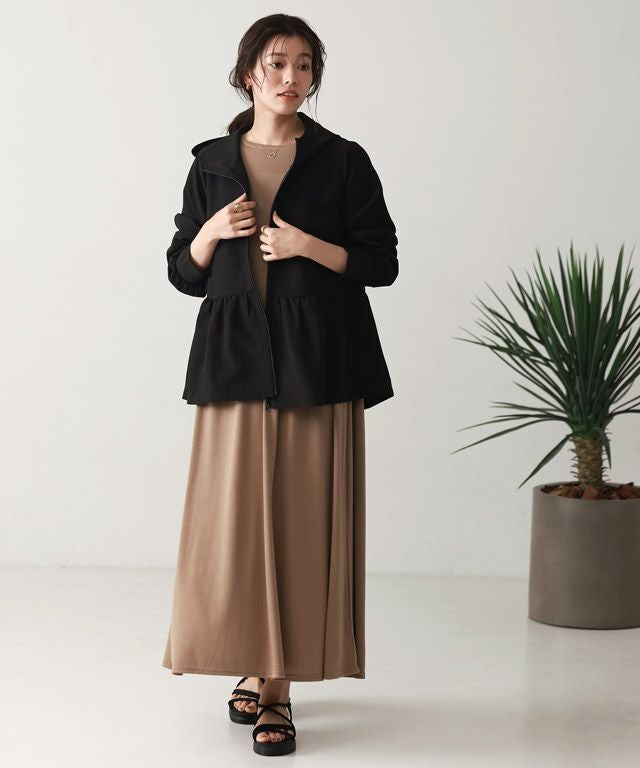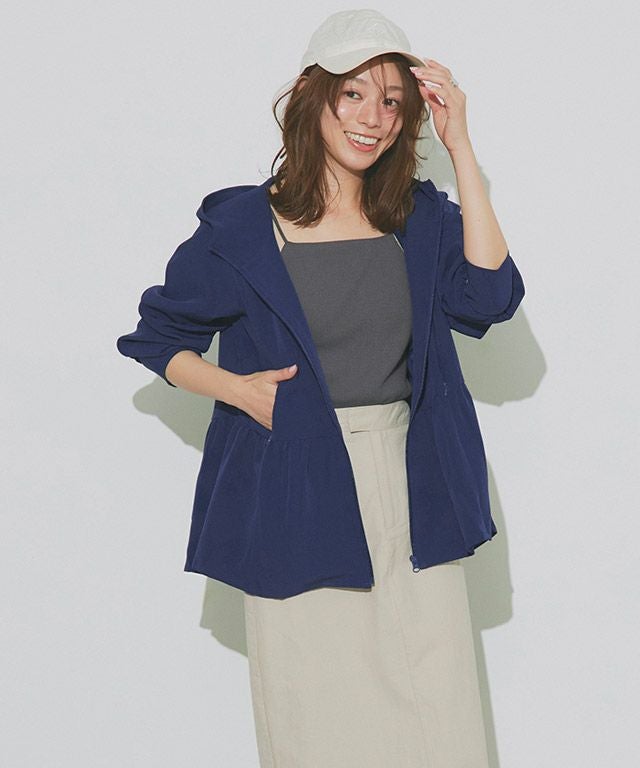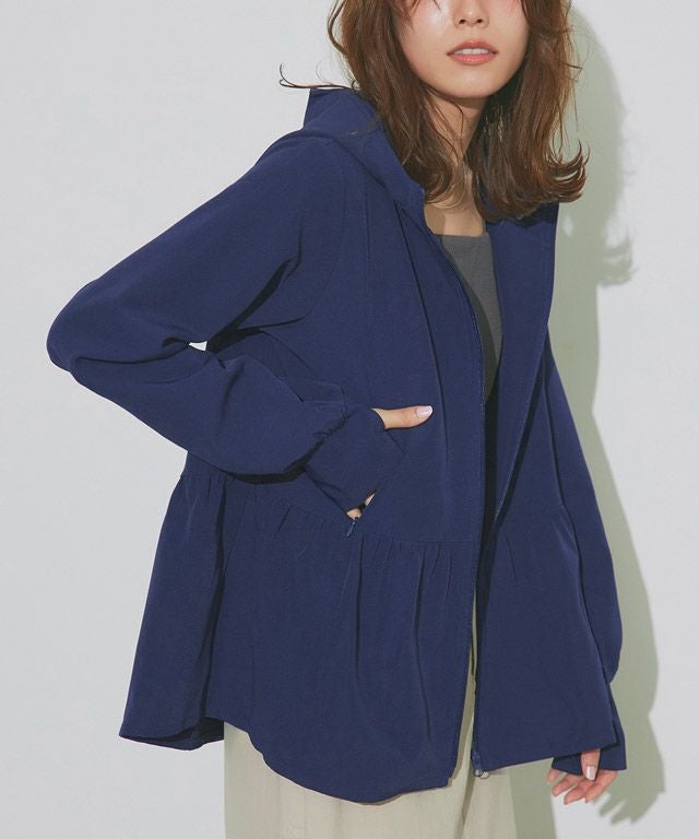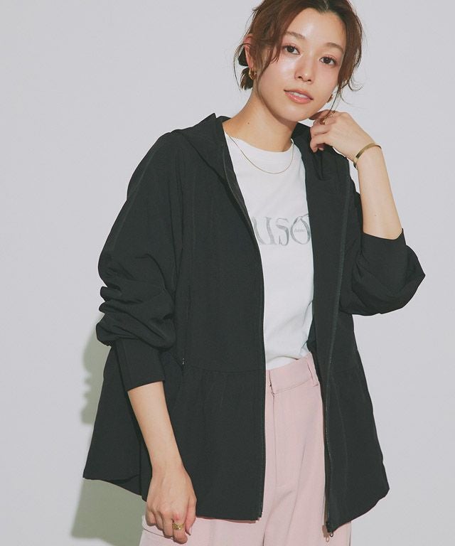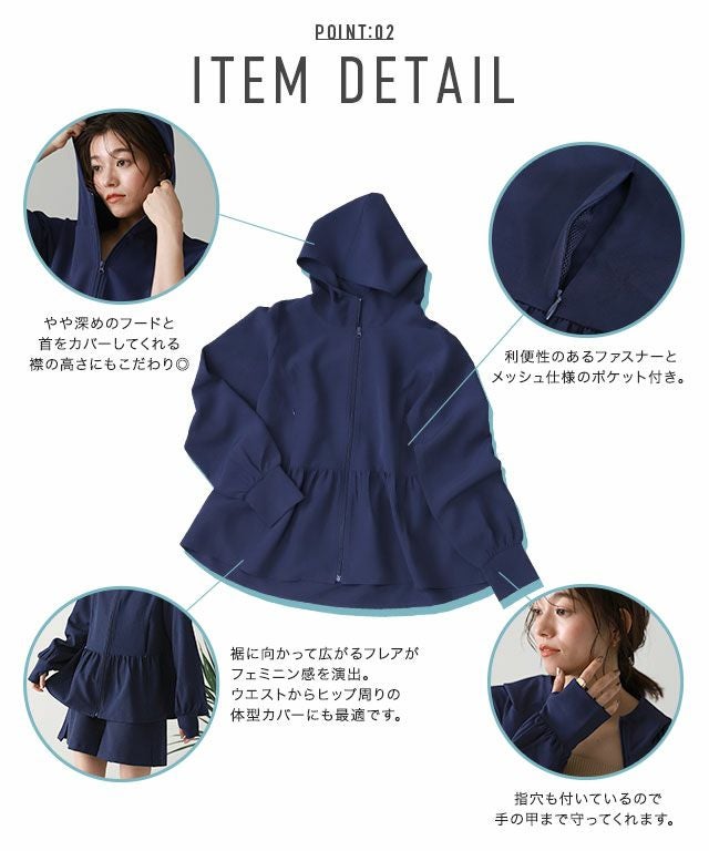 裾に向かって広がるフレアラインが、フェミニン感を演出。ウエストからヒップ周りの気になるラインもカバーしてくれます。やや深めのフードと、首をカバーしてくれる襟の高さにもこだわりました。指穴も付いているので手の甲まで守ってくれます。