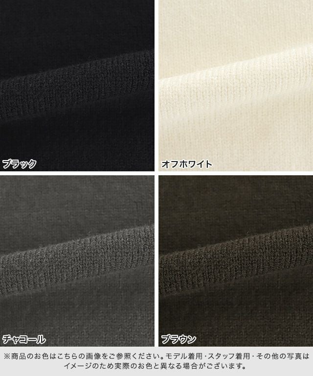 また、ニット製品は生産の過程上「生地を織る際の糸の継ぎ目」繊維の「混紡」、プレス加工、製品洗い加工によって形やサイズ(5cm前後)に誤差が生じる場合がございますが品質上の問題はございません。