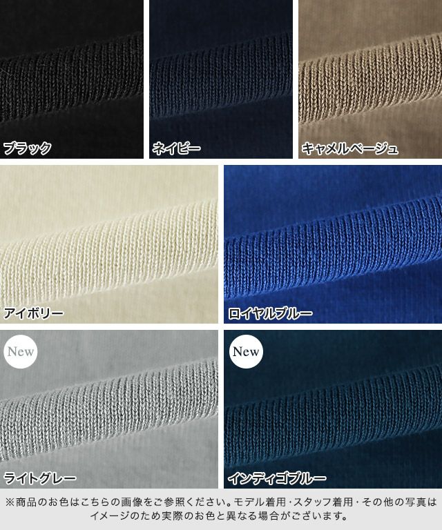 また、ニット製品は生産の過程上「生地を織る際の糸の継ぎ目」繊維の「混紡」、プレス加工、製品洗い加工によって形やサイズ(5cm前後)に誤差が生じる場合がございますが品質上の問題はございません。