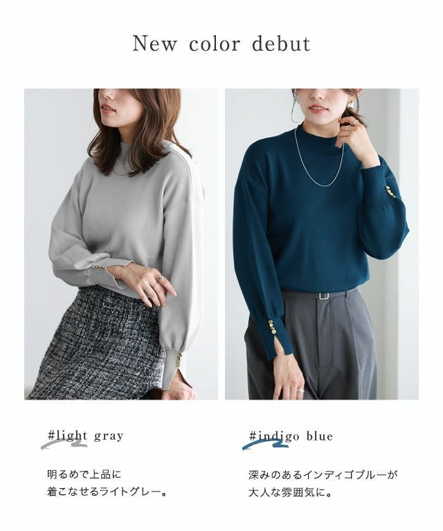 袖口のゴールドボタンがアクセントになったデザインニット。ボリュームスリーブが女性らしく、ゆったりシルエットと袖口のスリットが抜け感をプラス。上品な印象のハイネックで、インナーとしても着回しやすいデザインです。