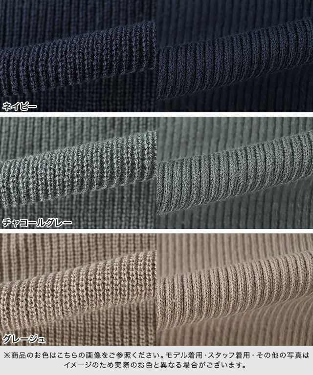 また、ニット製品は生産の過程上「生地を織る際の糸の継ぎ目」繊維の「混紡」、プレス加工、製品洗い加工によって形やサイズ(5cm前後)に誤差が生じる場合がございますが品質上の問題はございません。