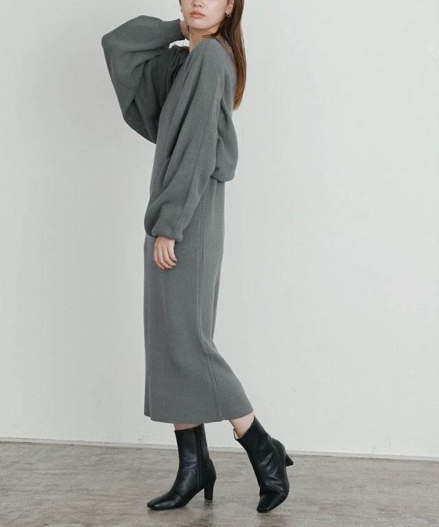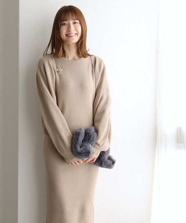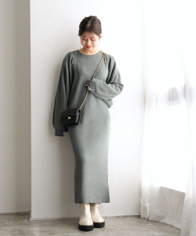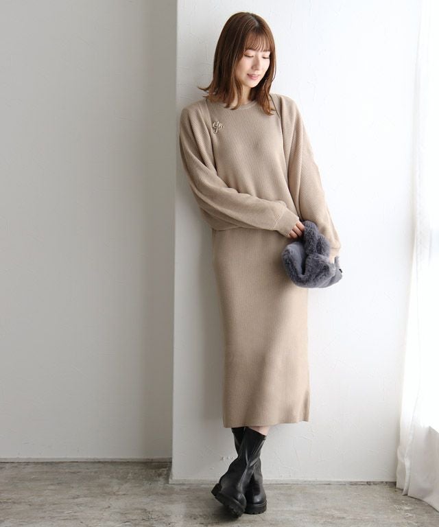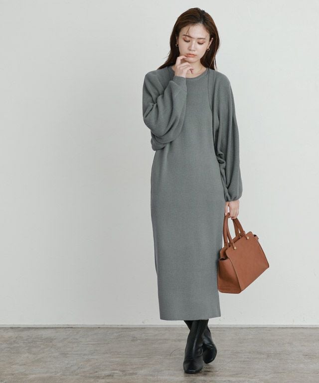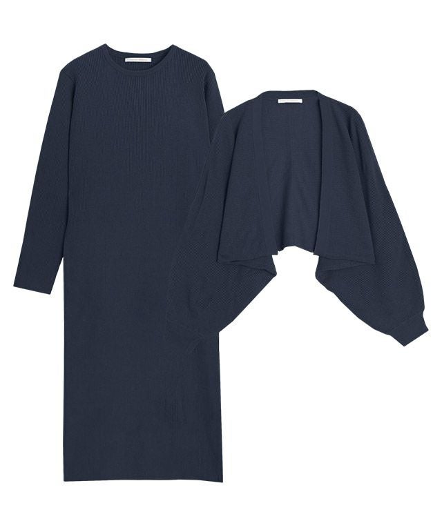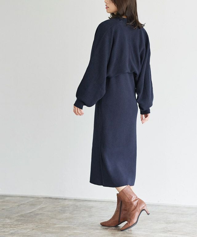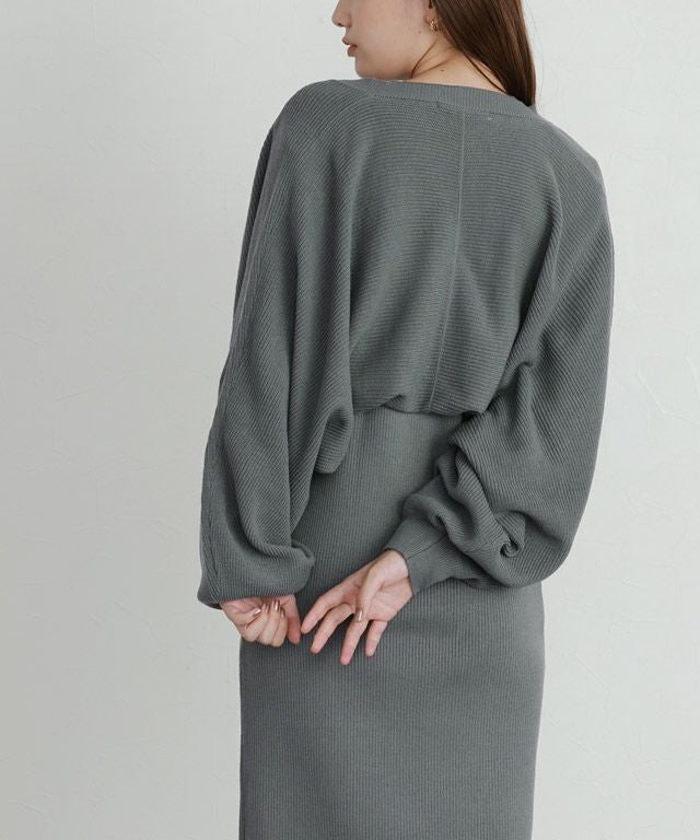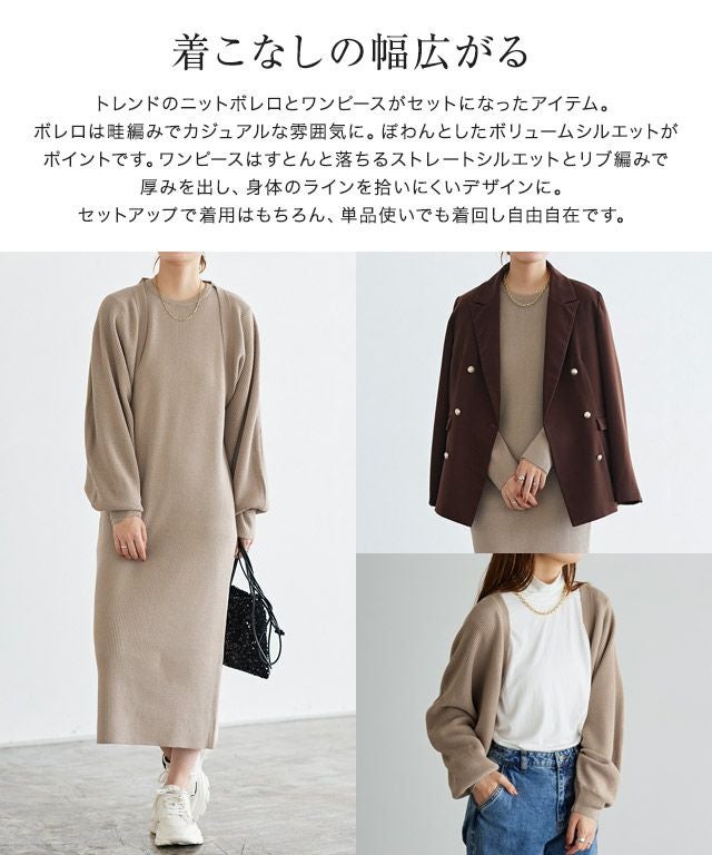 トレンドのニットボレロとワンピースがセットになったアイテム。ボレロは畦編みでカジュアルな雰囲気に。ぽわんとしたボリュームシルエットがポイントです。ワンピースはすとんと落ちるストレートシルエットとリブ編みで厚みを出し、身体のラインを拾いにくいデザインに。セットアップで着用はもちろん、単品使いでも着回し自由自在です。