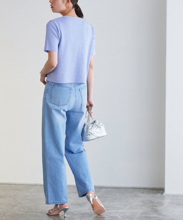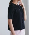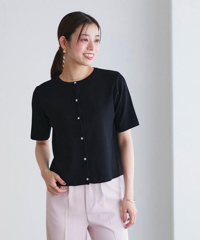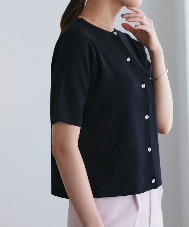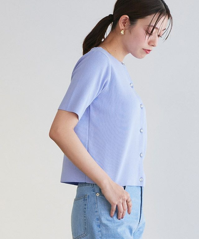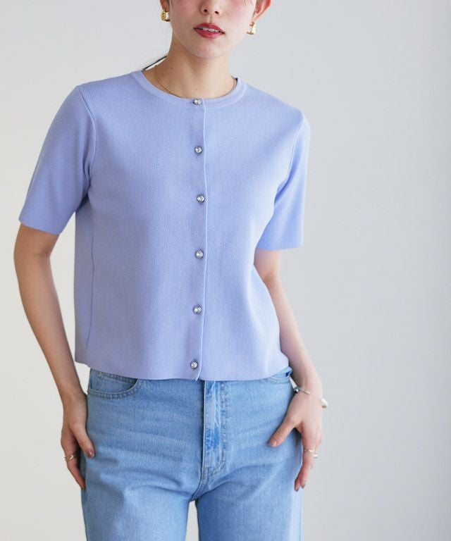 クロップド丈にすることで旬とスタイルアップを叶えてくれ、低身長さんもバランス良く、着用しやすいところも嬉しいポイント。ビジューボタンがスタイリングに華やかさをプラスし、女性らしい印象に導く一枚に仕上げました。