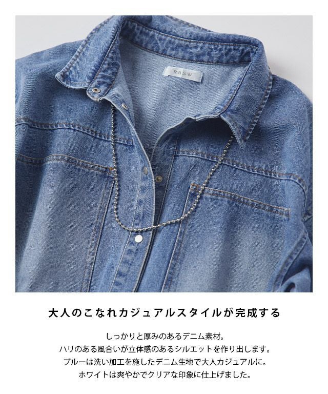 しっかりと厚みのあるデニム素材。ハリのある風合いが立体感のあるシルエットを作り出します。ブルーは洗い加工を施したデニム生地で大人カジュアルに。ホワイトは爽やかでクリアな印象に仕上げました。