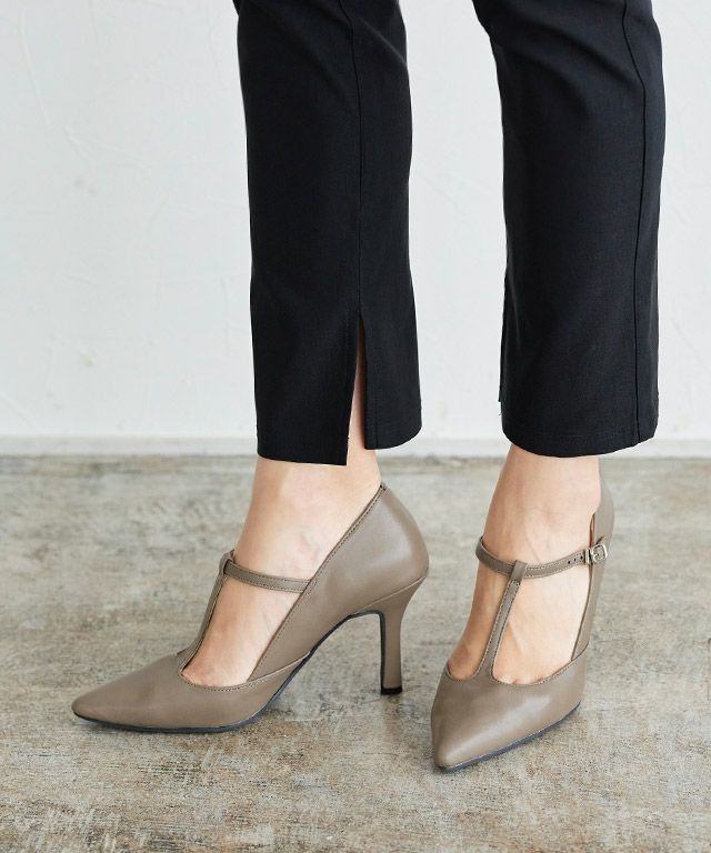 甲に施したTストラップが抜け感とアクセントをプラスし、足もきれいにみせてくれる優秀な一足。ポインテッドトゥやヒールも高めにすることで、女性らしい印象に仕上げました。
