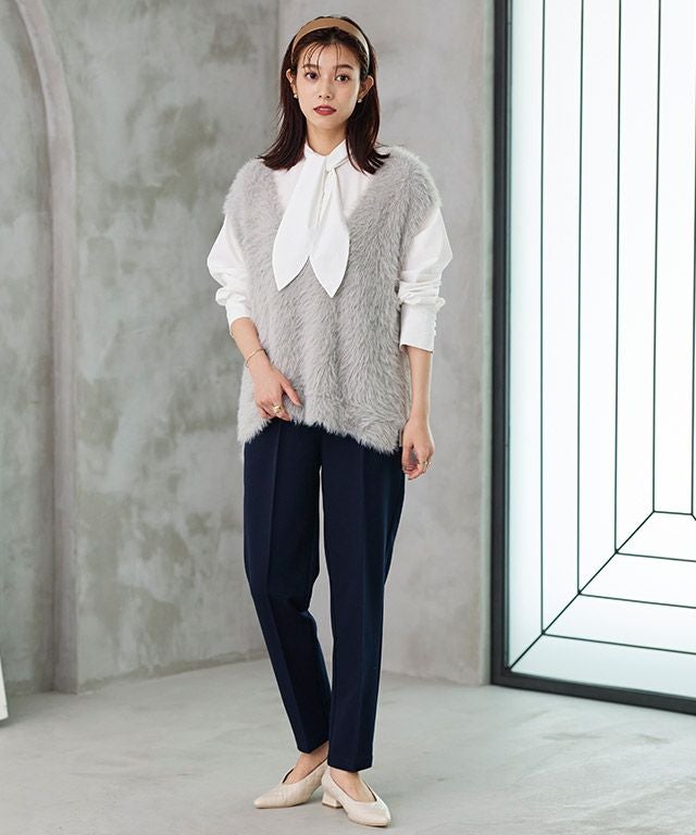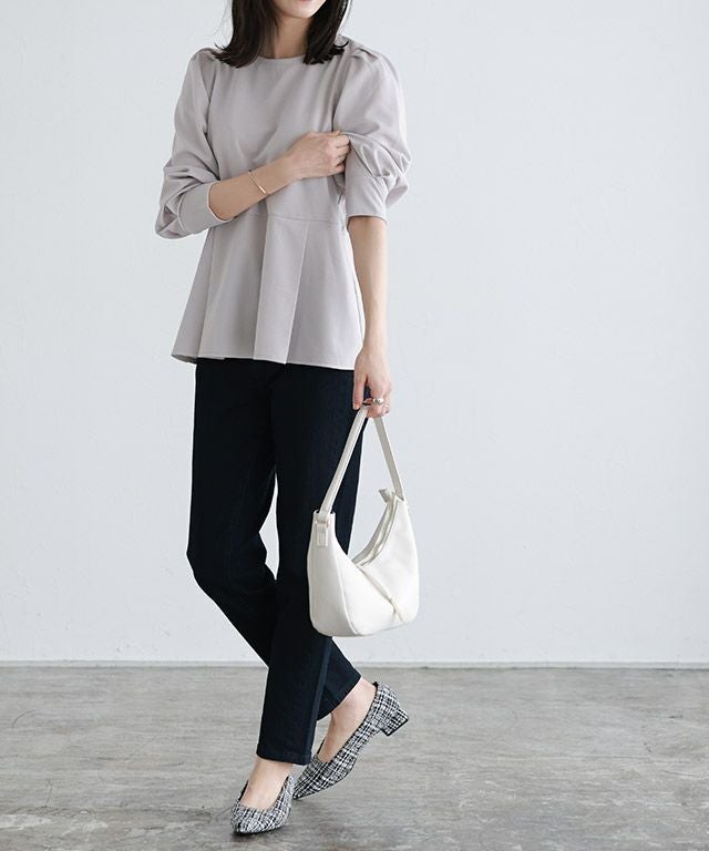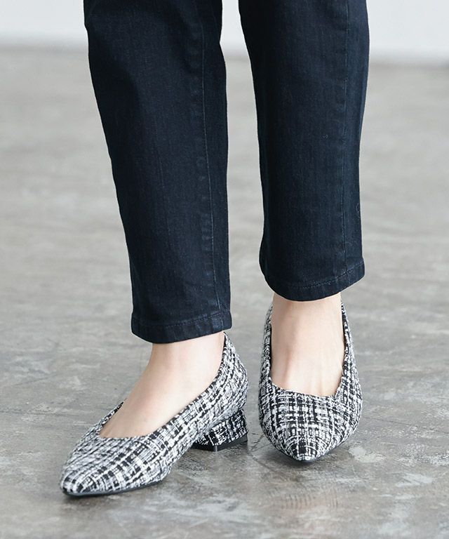 ポインテッドトゥが女性らしい印象に導いてくれ、アッパーのカットをなだらかなスクエアに仕上げることで、足元に抜け感をプラスします。ヒールは低めのチャンキーにすることで安定感もあり、歩きやすいとこも嬉しいポイント◎