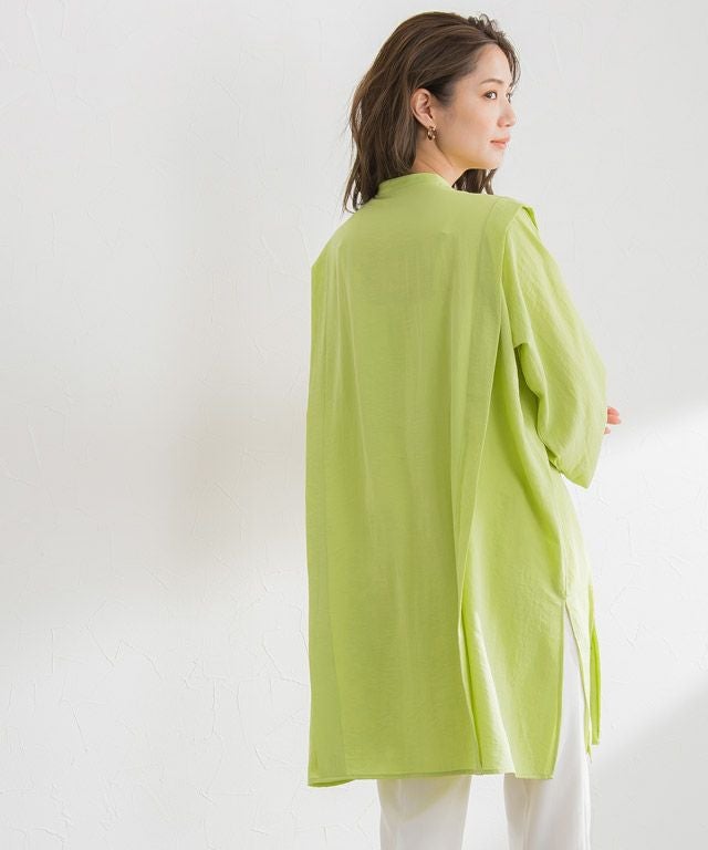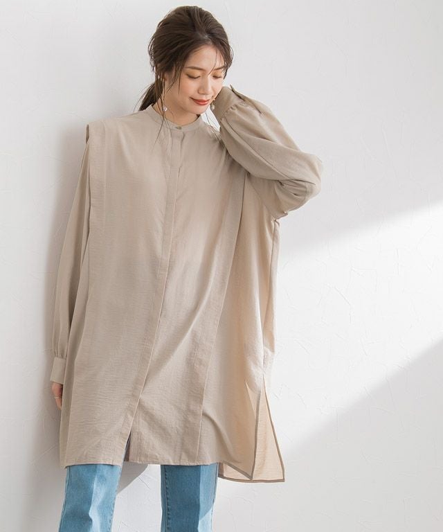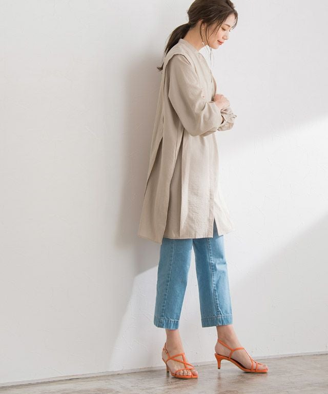 肩から裾にかけて施されたタックデザインがシャープな印象に。ゆったりとしたサイズ感で体のラインもしっかりカバーしながら、抜け感のある着こなしに導きます。