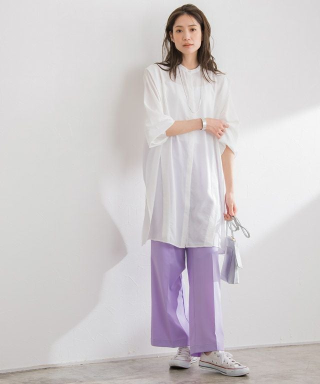 滑らかな肌触りと上品な落ち感のある風合いが、女性らしさをアップさせる素材使い。程良い透け感とソフトな肌触りでリラクシーな着心地です。