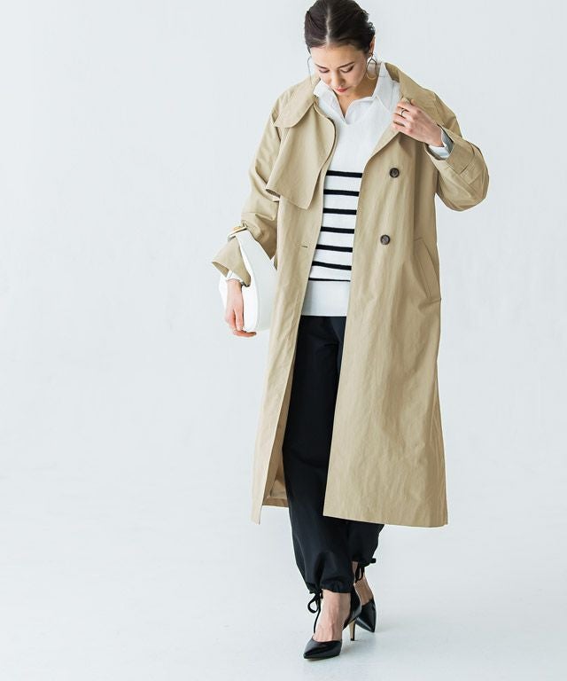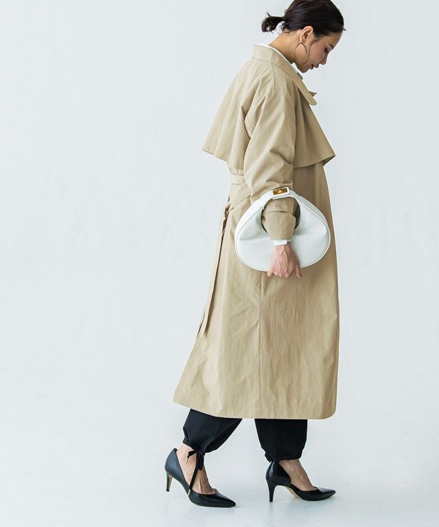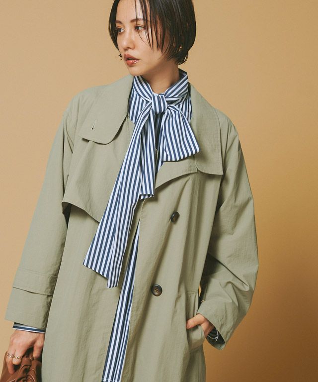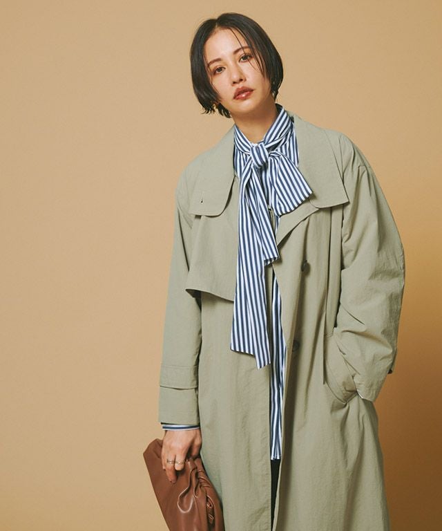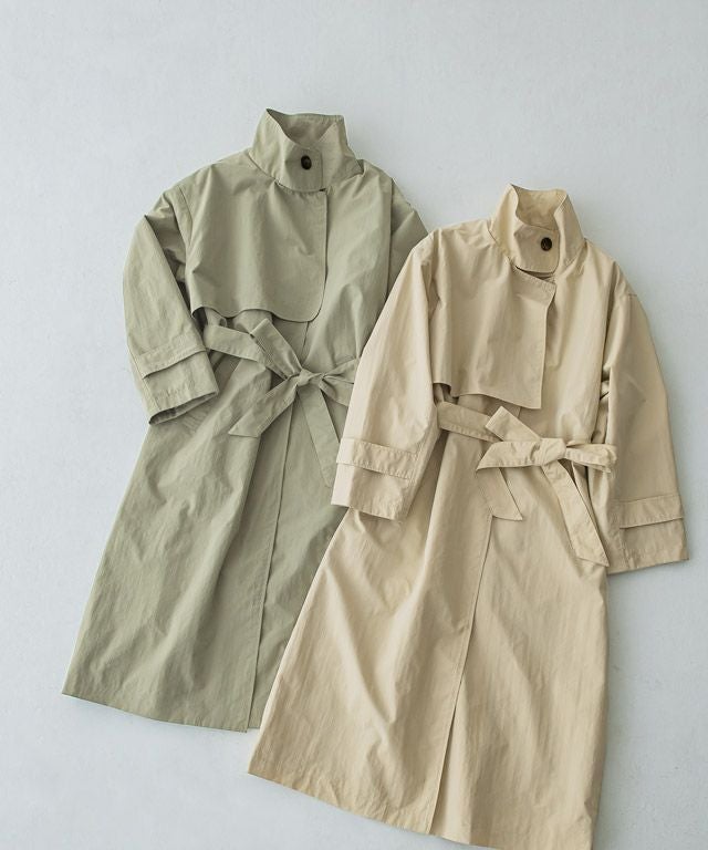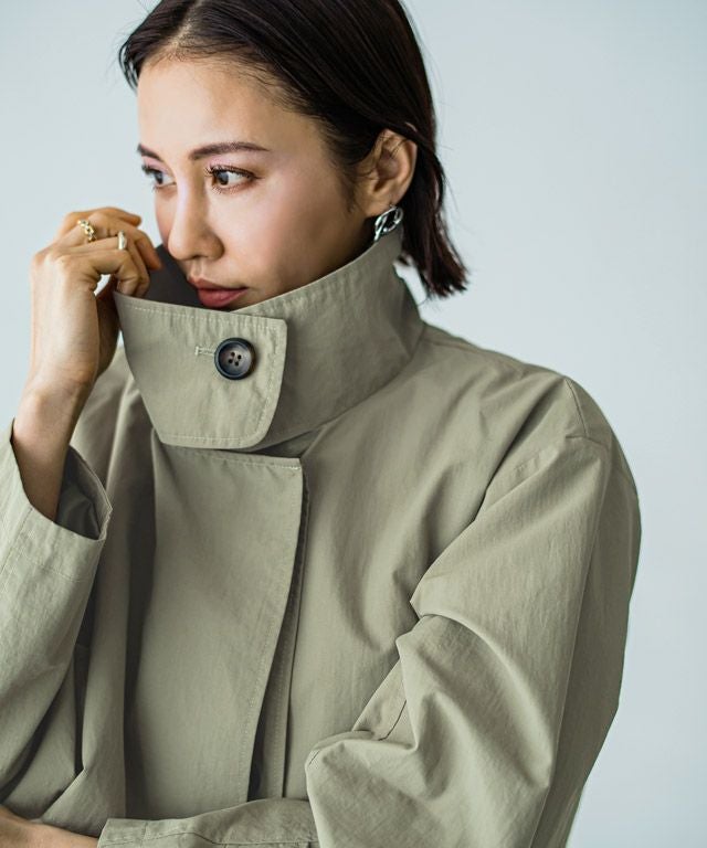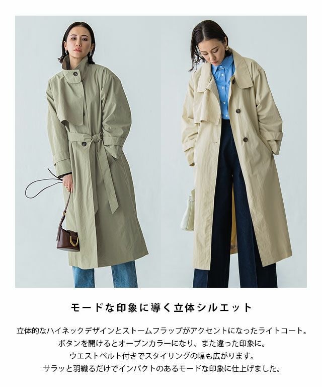 立体的なハイネックデザインとストームフラップがアクセントになったライトコート。ボタンを開けるとオープンカラーになり、また違った印象に。ウエストベルト付きでスタイリングの幅も広がります。サラッと羽織るだけでインパクトのあるモードな印象に仕上げました。カジュアルにもきれいめにも着回せる一枚です。