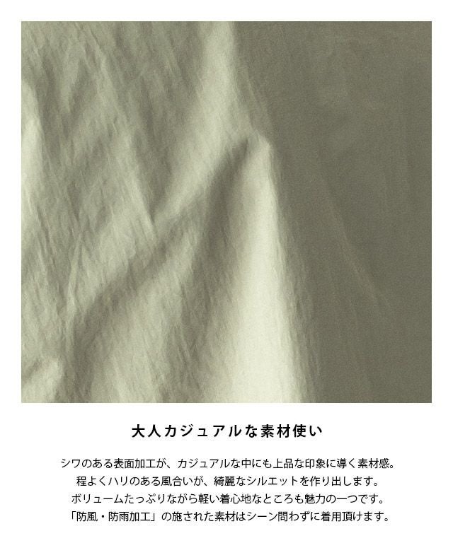 シワのある表面加工が、カジュアルな中にも上品な印象に導く素材感。程よくハリのある風合いが、綺麗なシルエットを作り出します。ボリュームたっぷりながら軽い着心地なところも魅力の一つです。「防風・防雨加工」の施された素材はシーン問わずに着用頂けます。
