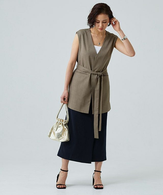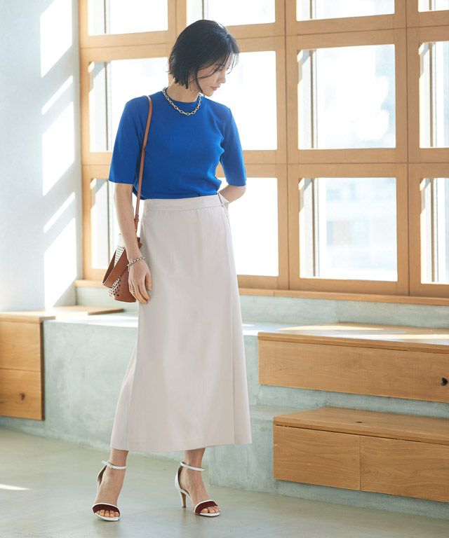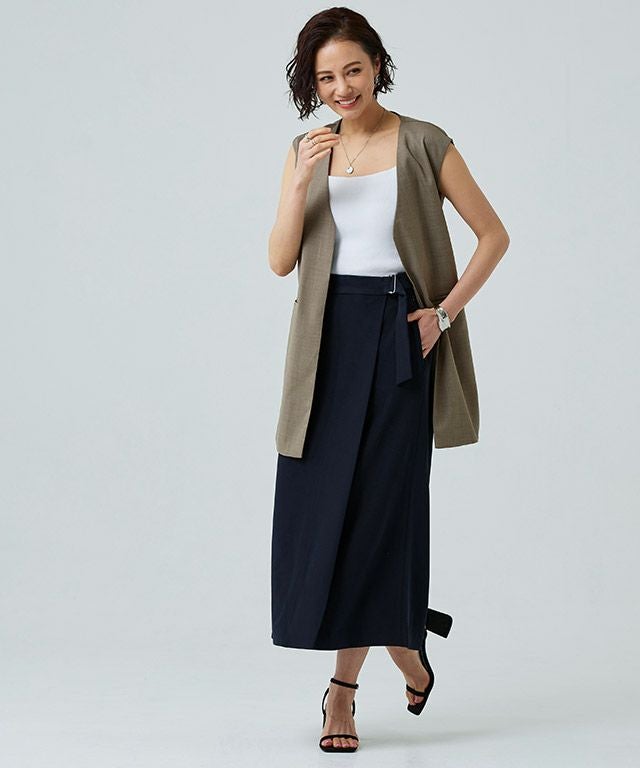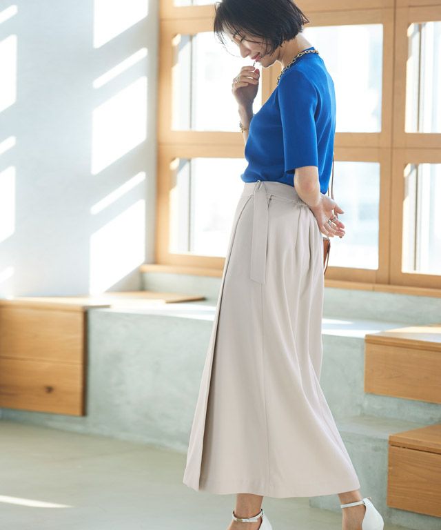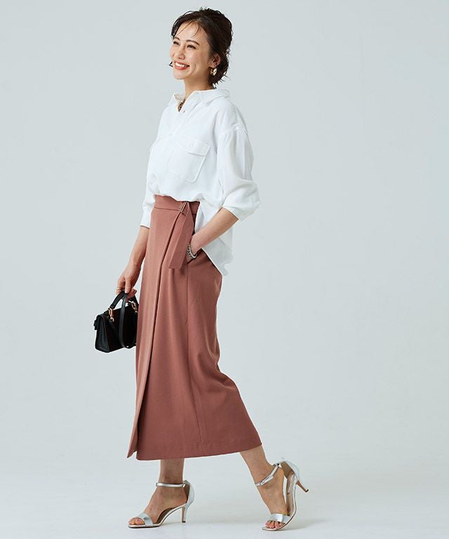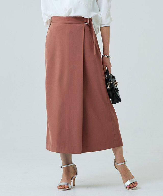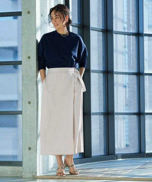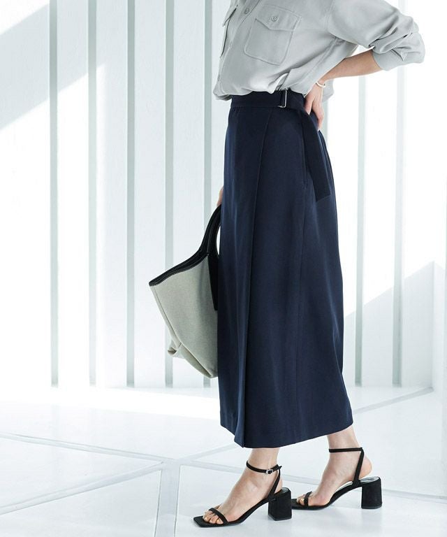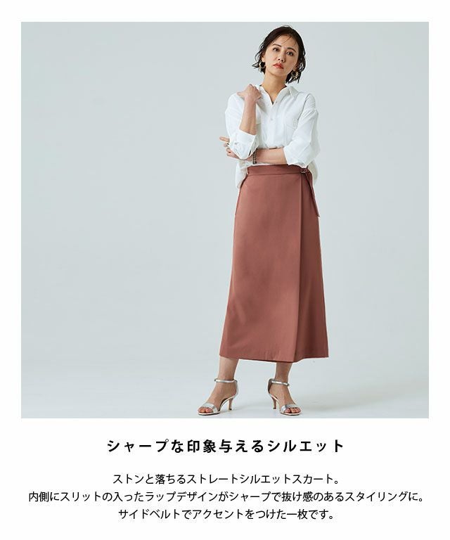 落ち感と、きめの細かい素材感が大人の上品な雰囲気を叶えます。程良く厚みもあり、シーズン問わず活躍できるところも魅力の一つです。 ストンと落ちるストレートシルエットスカート。内側にスリットの入ったラップデザインがシャープで抜け感のあるスタイリングに。サイドベルトでアクセントをつけた一枚です。歩いてもめくれない仕様になっているので足さばきもしやすいデザイン。ON/OFF問わず着用できます。 【ブランド】 RASW(ラス)