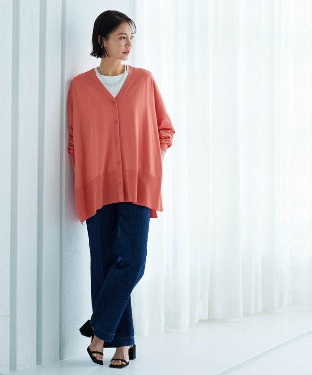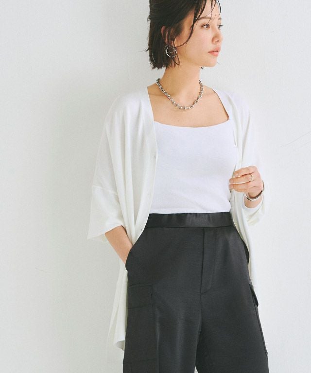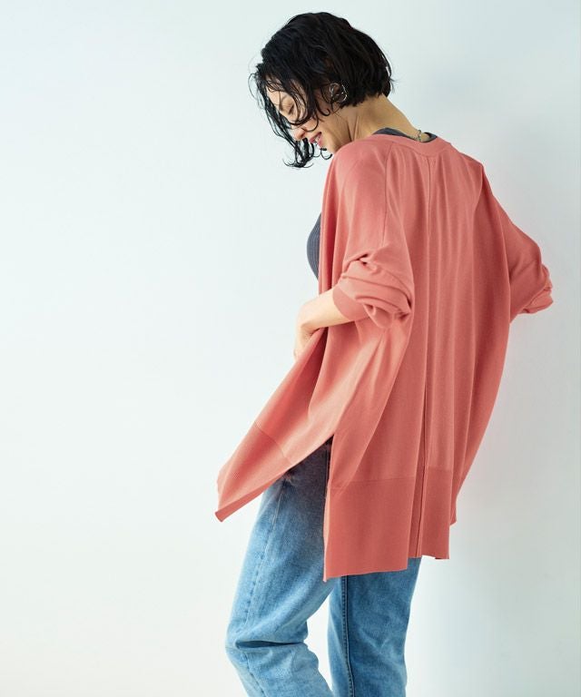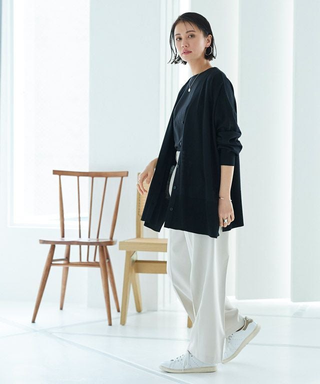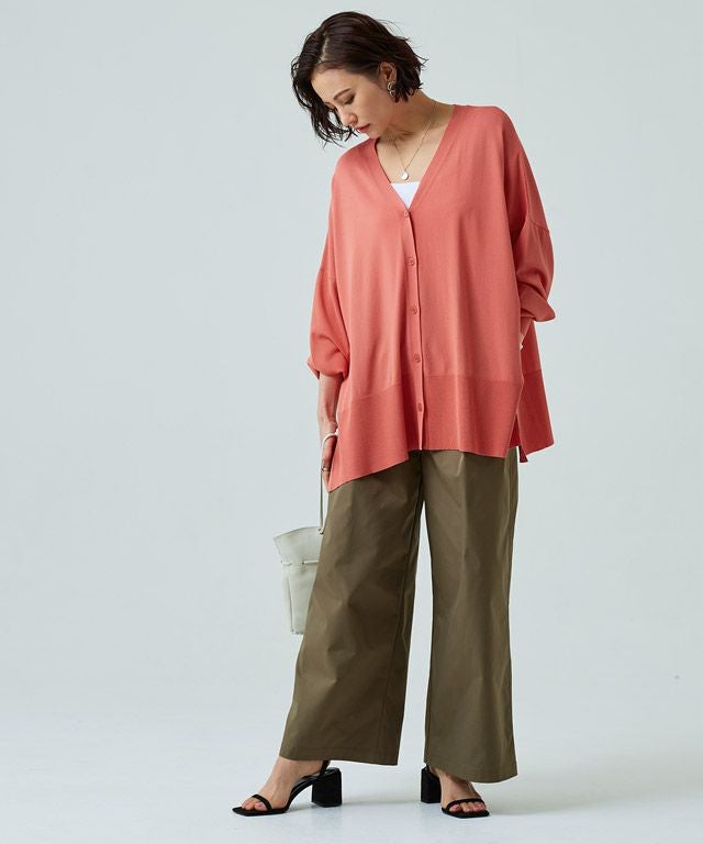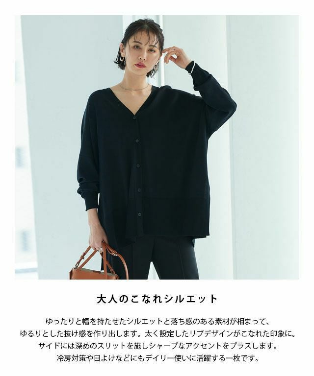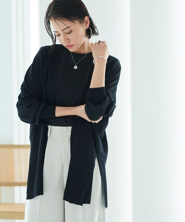 ゆったりと幅を持たせたシルエットと落ち感のある素材が相まって、ゆるりとした抜け感を作り出します。太く設定したリブデザインがこなれた印象に。サイドには深めのスリットを施しシャープなアクセントをプラスします。冷房対策や日よけなど、デイリー使いに活躍する一枚です。