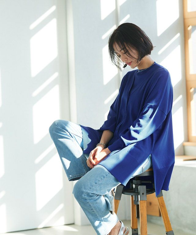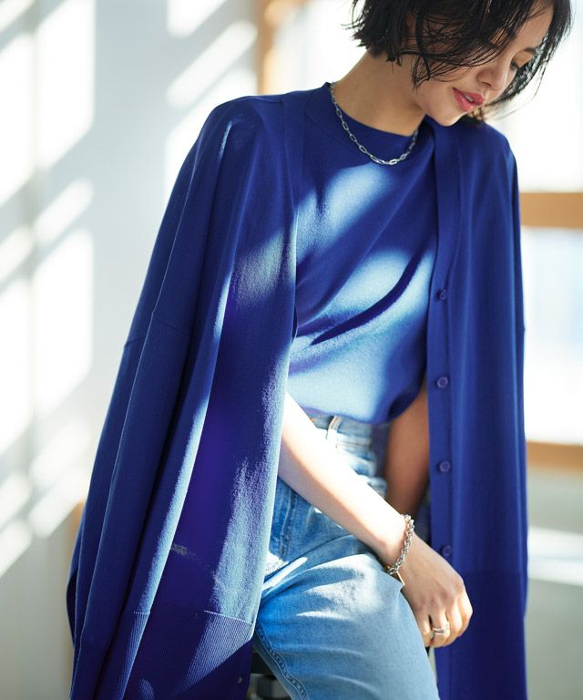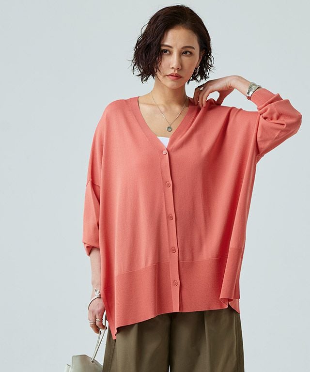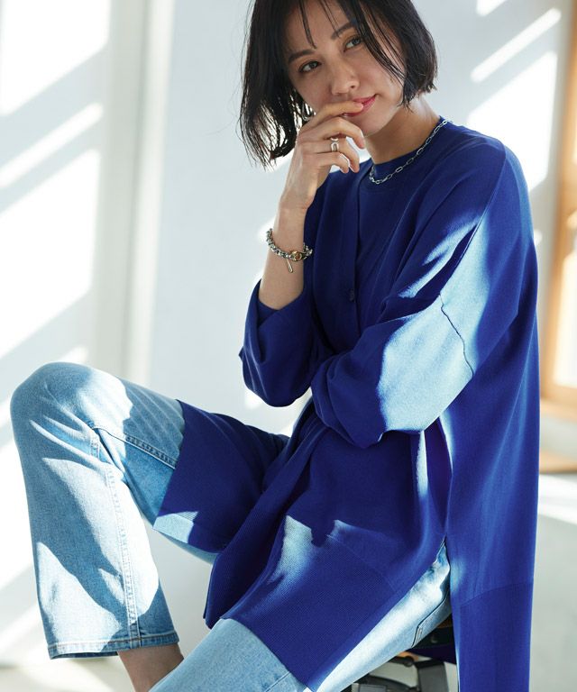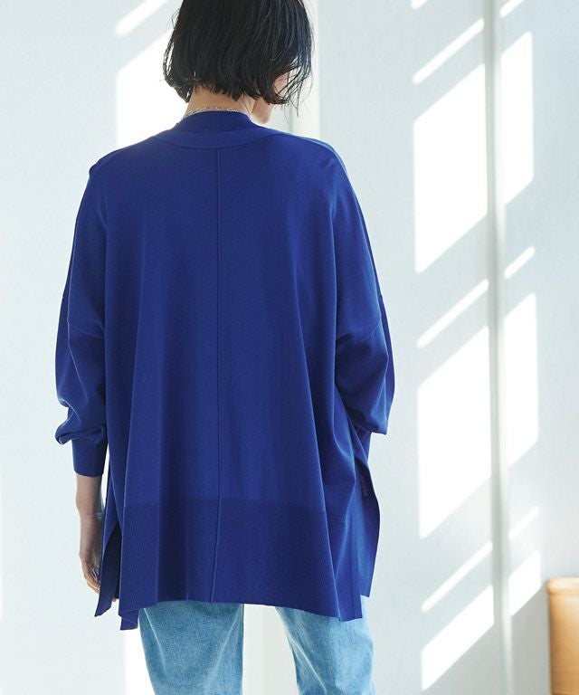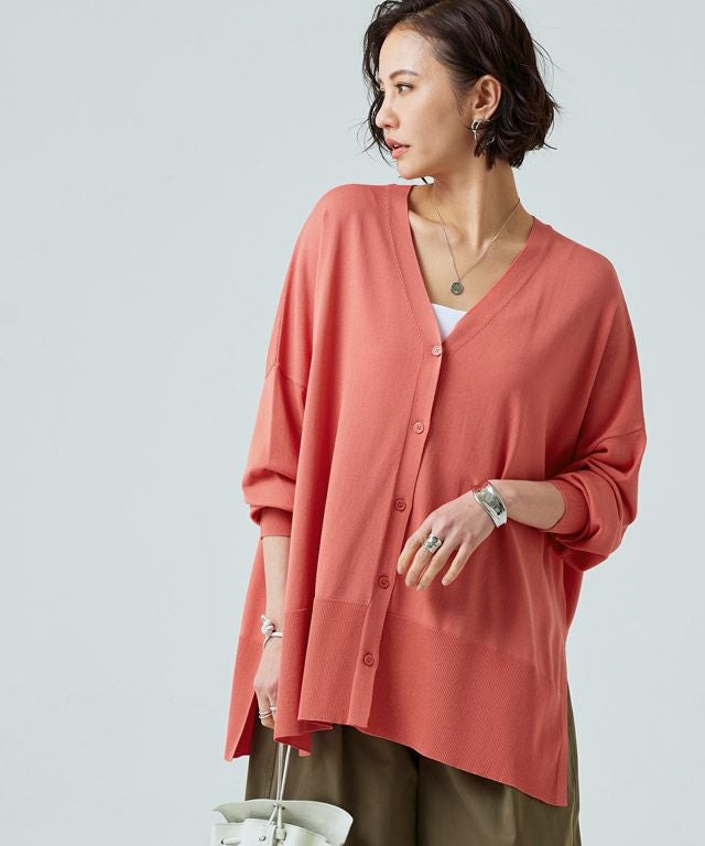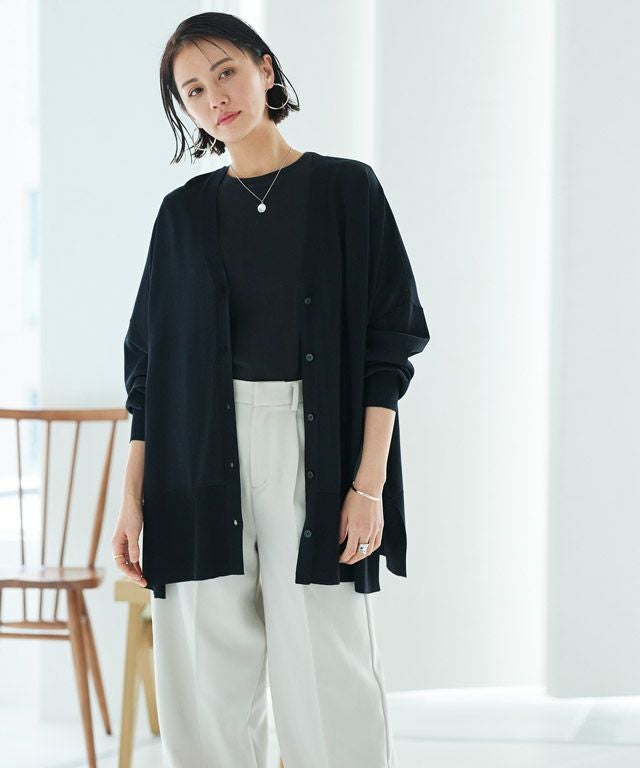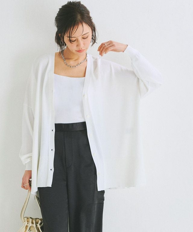 ゆったりと幅を持たせたシルエットと落ち感のある素材が相まって、ゆるりとした抜け感を作り出します。太く設定したリブデザインがこなれた印象に。サイドには深めのスリットを施しシャープなアクセントをプラスします。冷房対策や日よけなど、デイリー使いに活躍する一枚です。