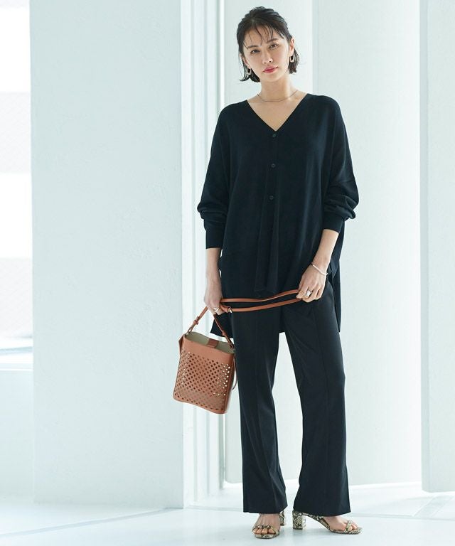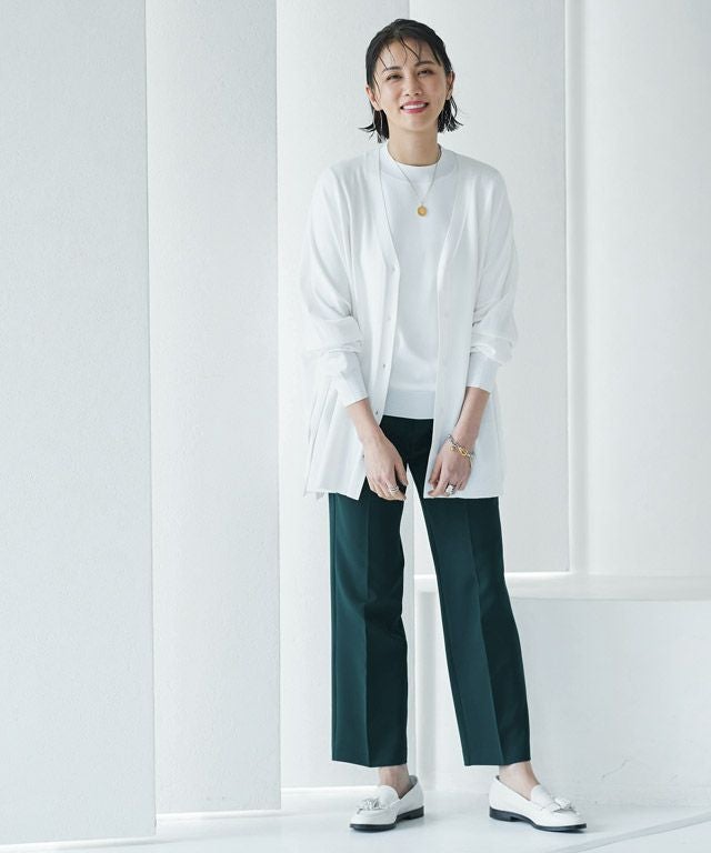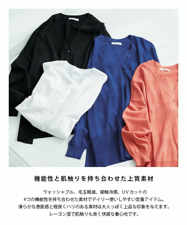 ウォッシャブル、毛玉軽減、接触冷感、UVカットの4つの機能性を持ち合わせた素材でデイリー使いしやすい定番アイテム。滑らかな表面感と程良くハリのある素材は大人っぽく上品な印象を与えます。レーヨン混で肌触りも良く快適な着心地です。