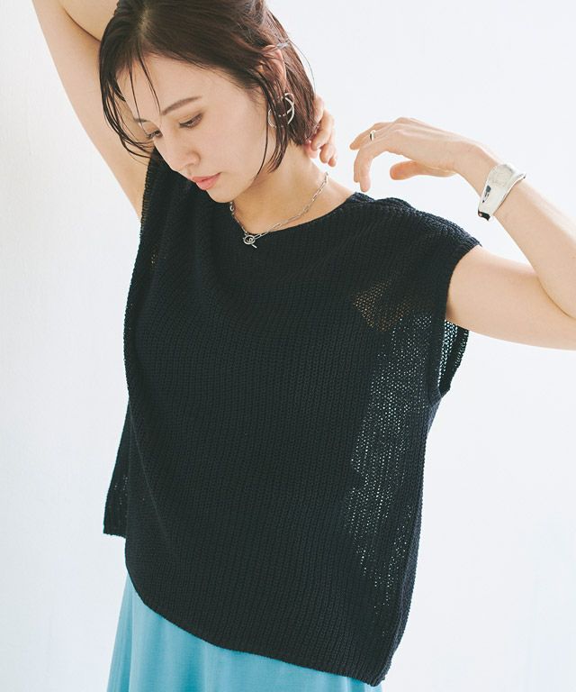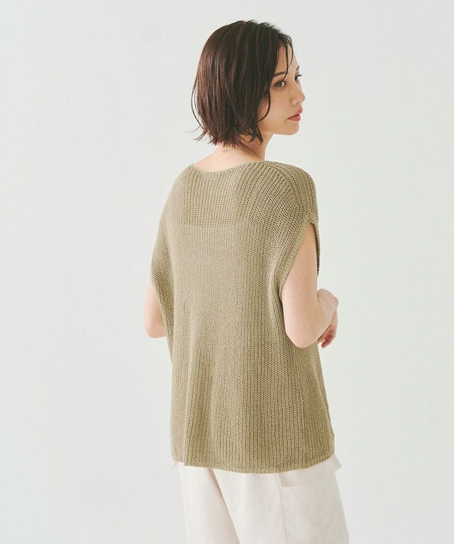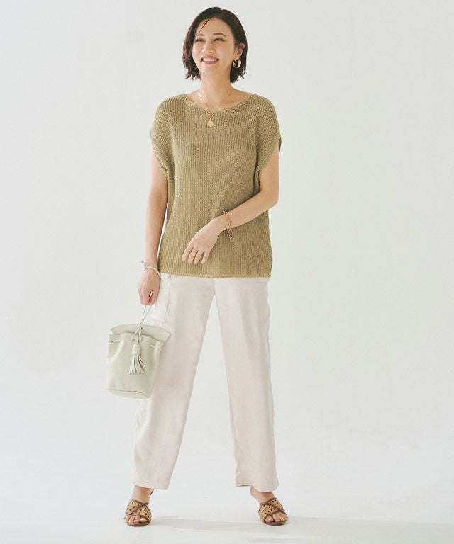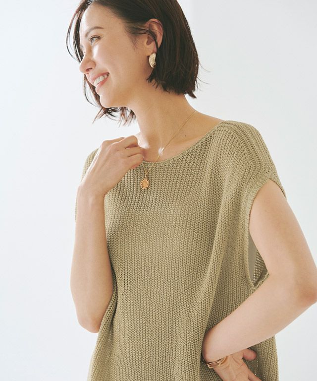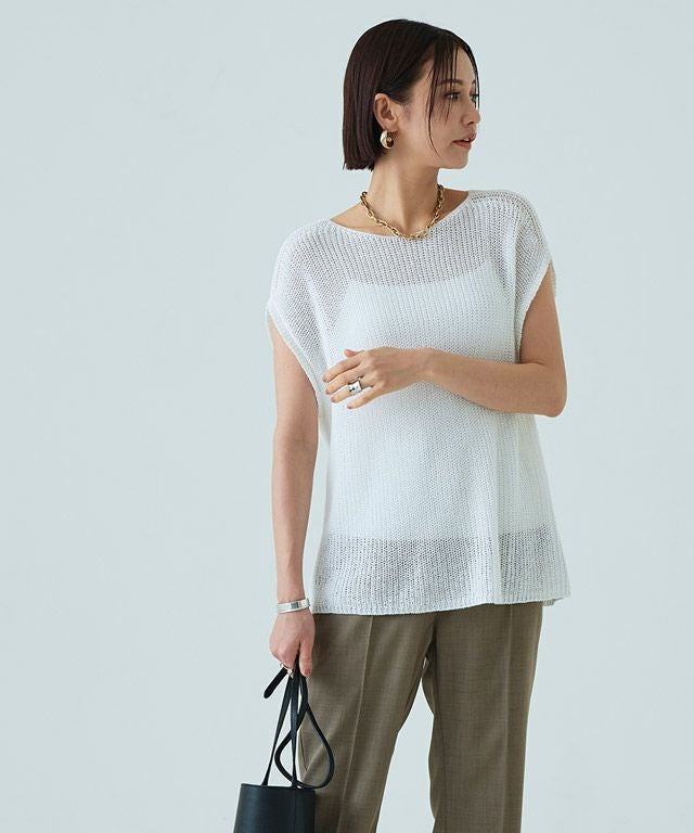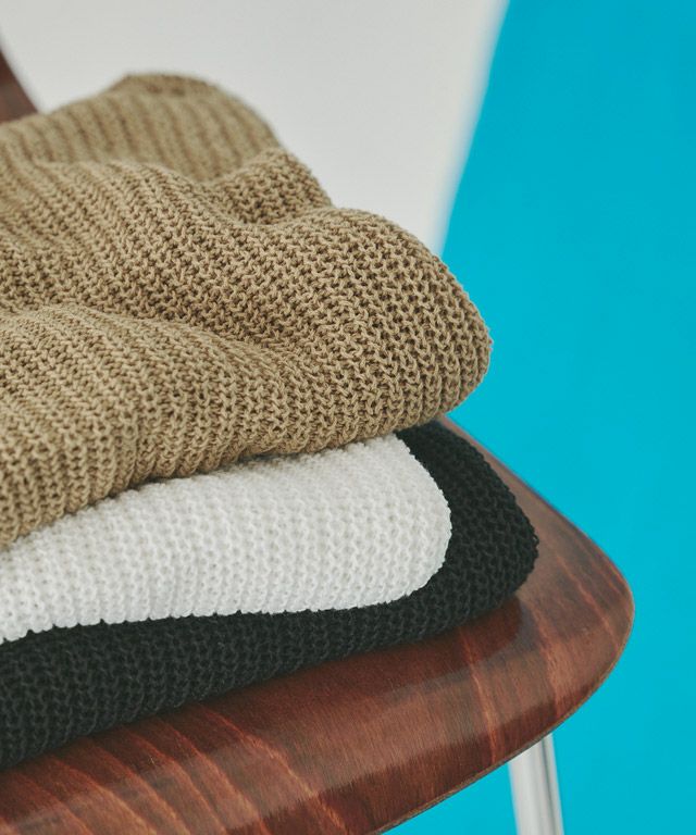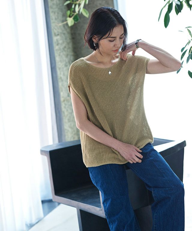 リネンならではの肌触りと、清涼感がラフな表情に導きます。ざっくりとした編地が程良い透け感を作り出し涼し気な印象に。柔らかく、肌なじみの良い風合いが魅力です。