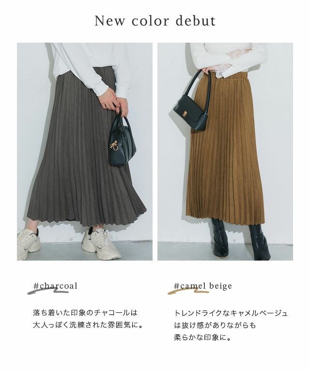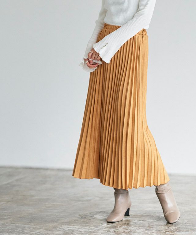 大人フェミニンのマストアイテム“スエードタッチロングプリーツスカート” 滑らかな生地感が上品な、フェイクスエード素材。コーディネートに取り入れるだけでぐっと季節感をプラス◎ 程よい落ち感のプリーツデザインが落ち着いたイメージ漂う、広がり過ぎないフレアシルエット。ブーツと合わせやすいロング丈で、すっきりと大人ムードを演出します。 【ブランド】 Pierrot(ピエロ)