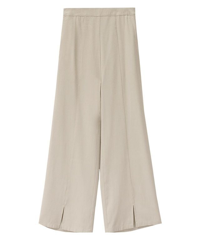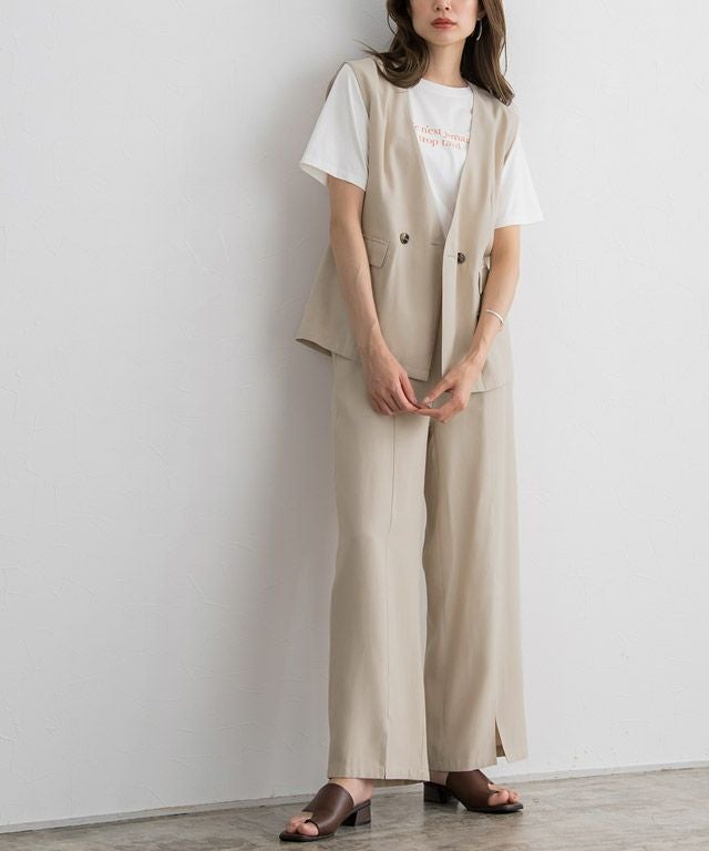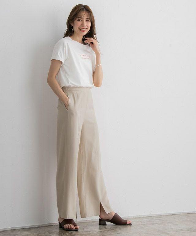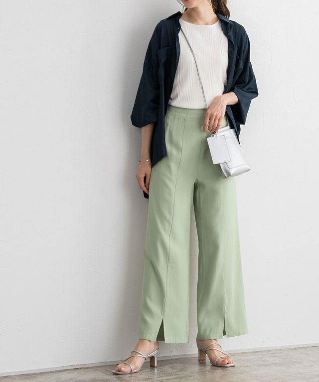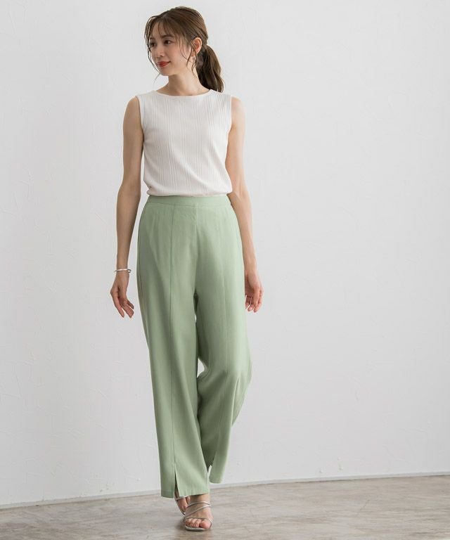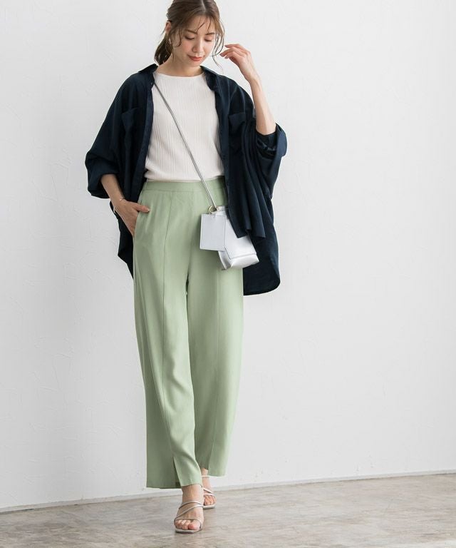 ストレートなシルエットに裾のスリットが、スタイリングに抜け感とアクセントをプラスしてくれる一枚。脚のラインを拾いにくいところも嬉しいポイント。同素材のジレとのセットアップ着用もおすすめです。