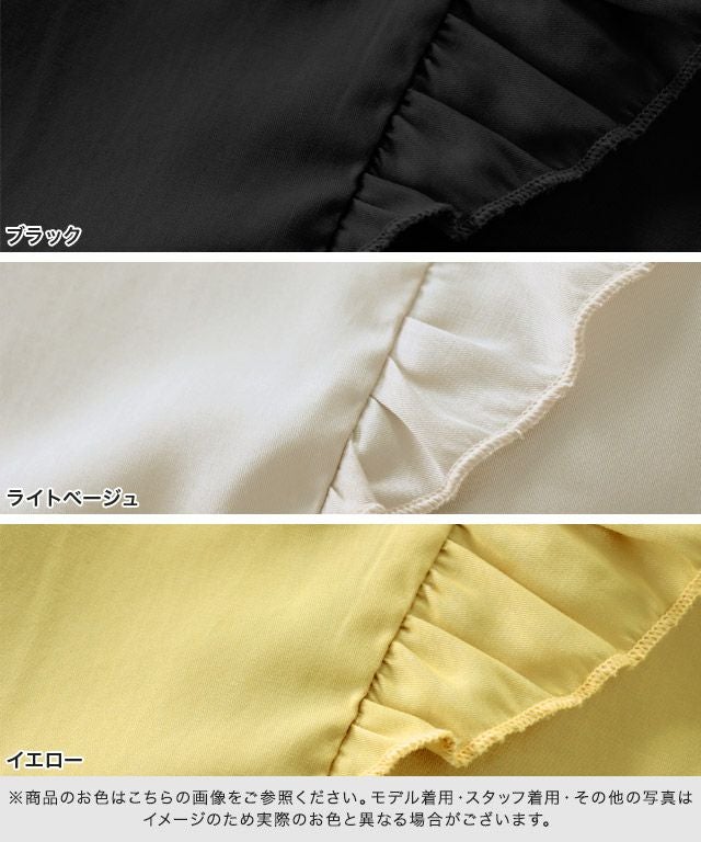C 着丈はお尻が3分の2隠れる丈感でした。袖丈は肩が隠れるフレンチスリーブです。身幅は程よいゆとりがありました。肩周りのフリルが華やかで着映えします◎軽い着心地で落ち感があり柔らかく肌触りの良い生地でした。
