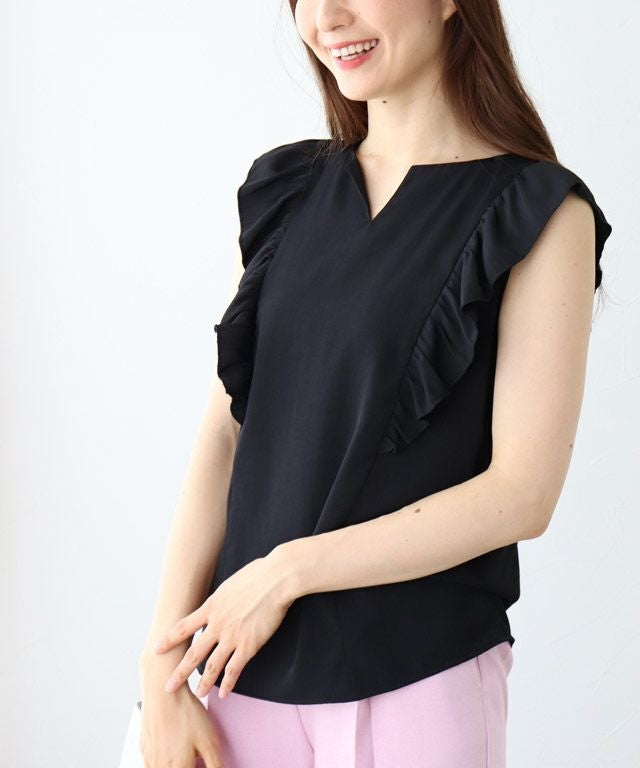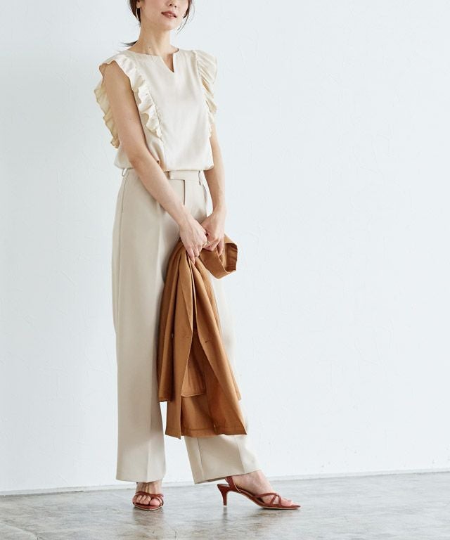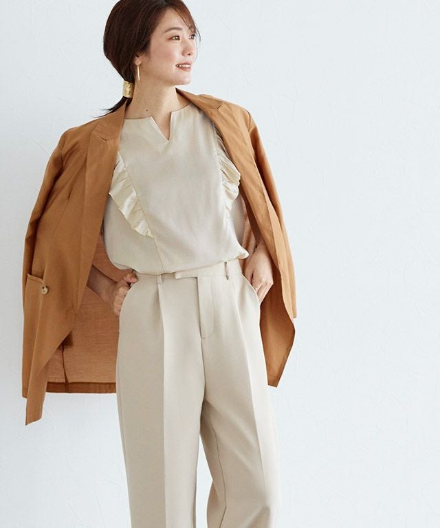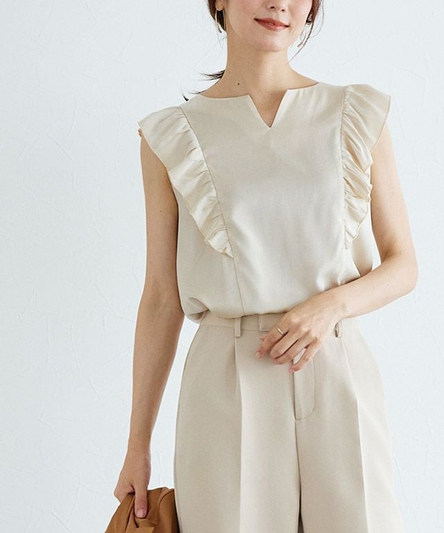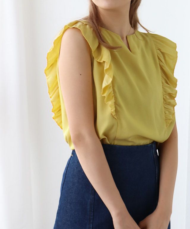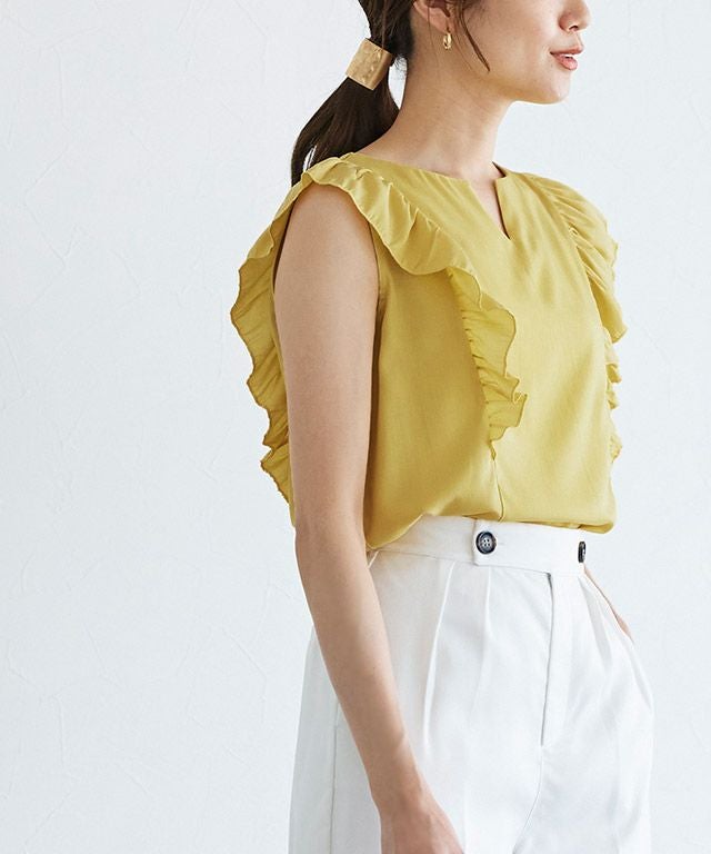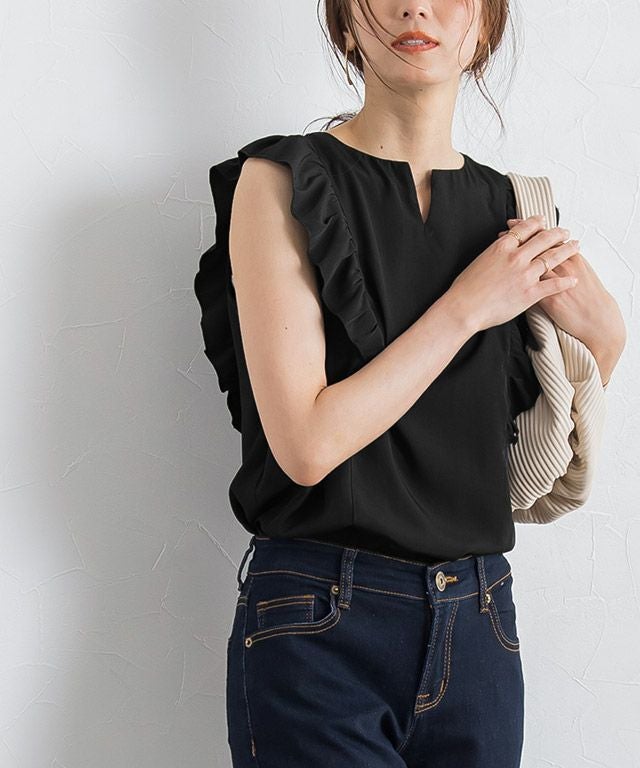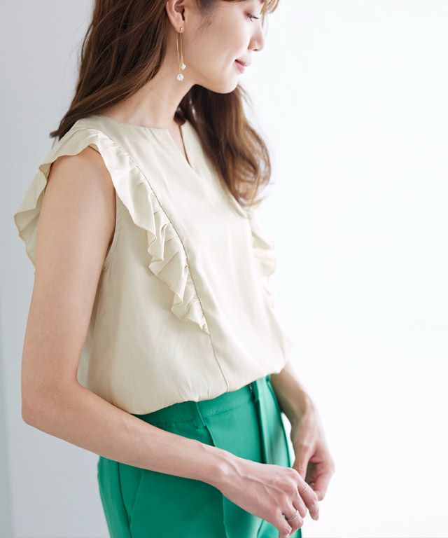 肩のフリルがアクセントになり、華奢に見せてくれるデザインブラウス。キーネックで抜け感と上品さをプラスしました。きれいめにもカジュアルにも着回せるアイテムです。