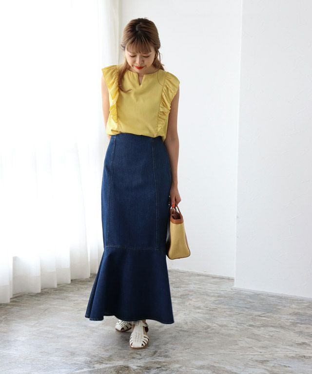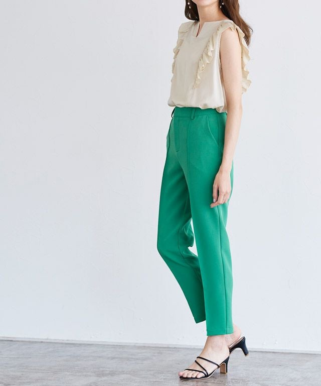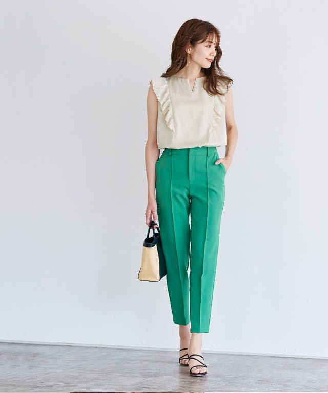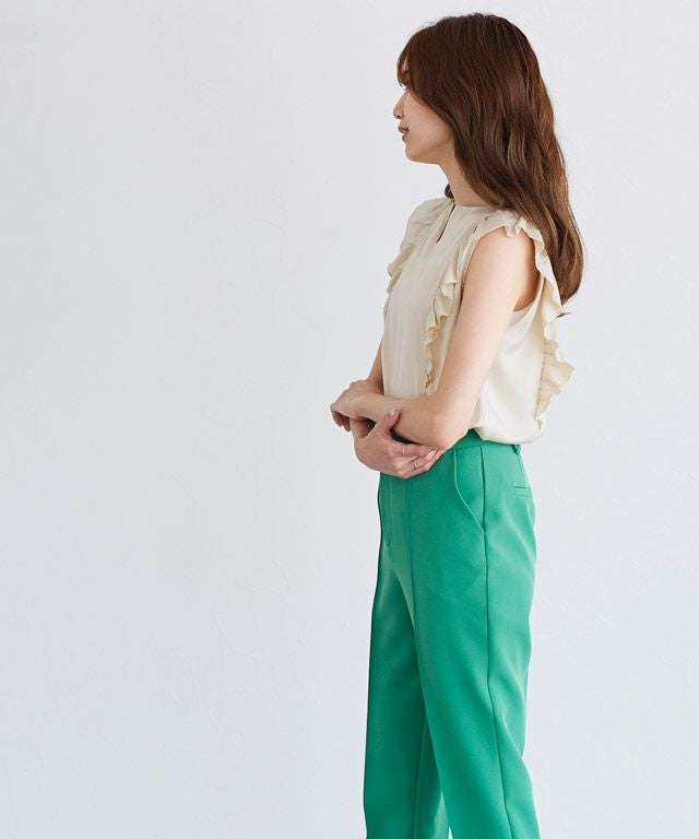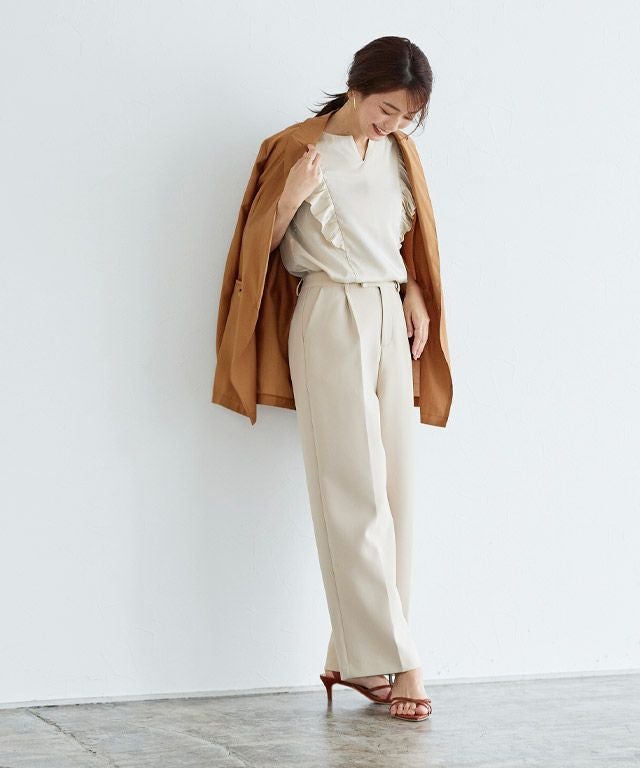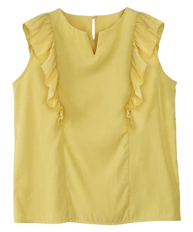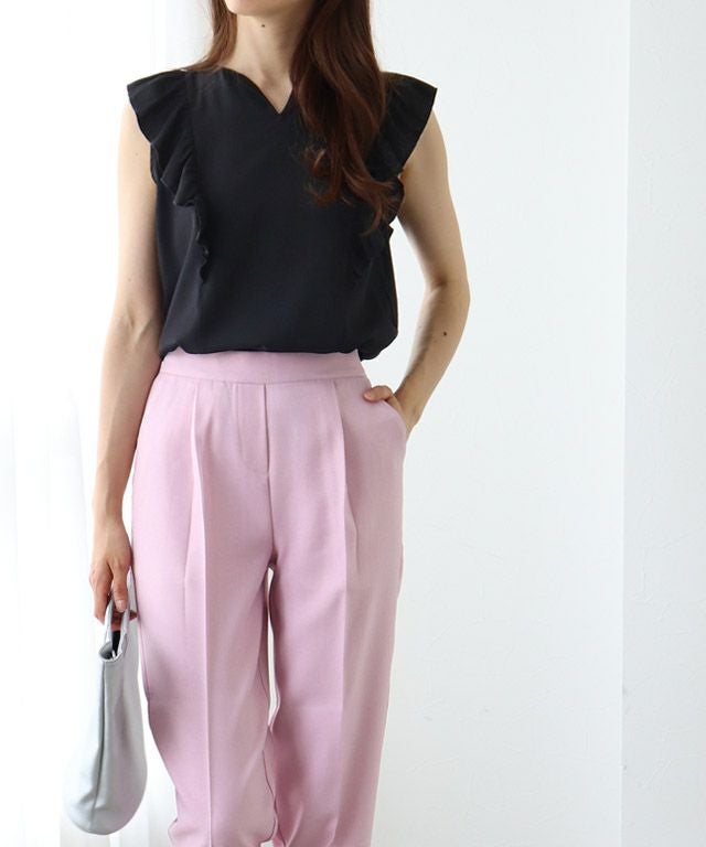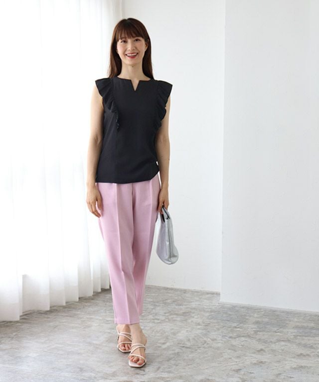 肩のフリルがアクセントになり、華奢に見せてくれるデザインブラウス。キーネックで抜け感と上品さをプラスしました。きれいめにもカジュアルにも着回せるアイテムです。