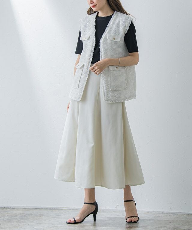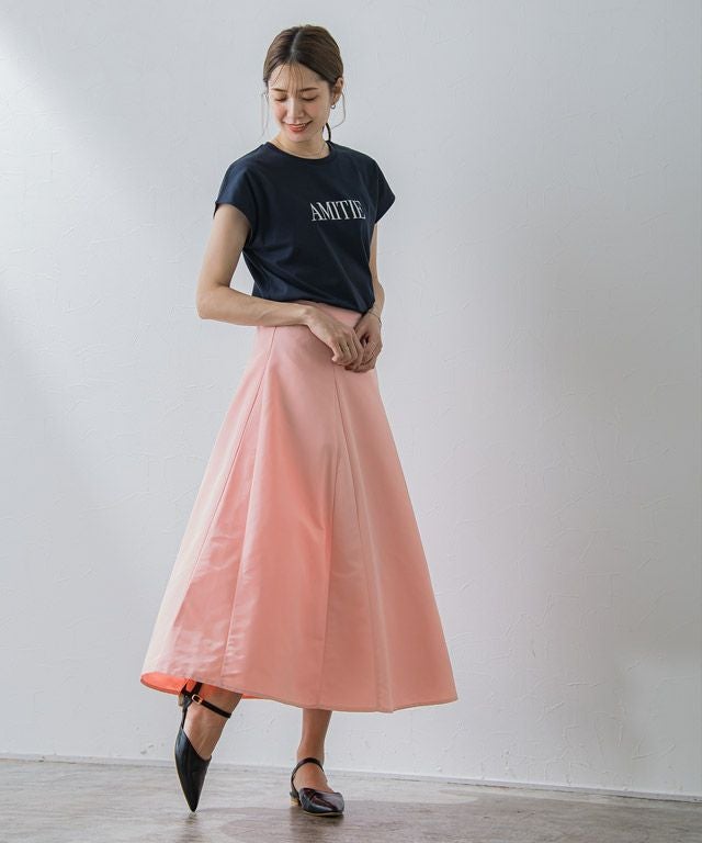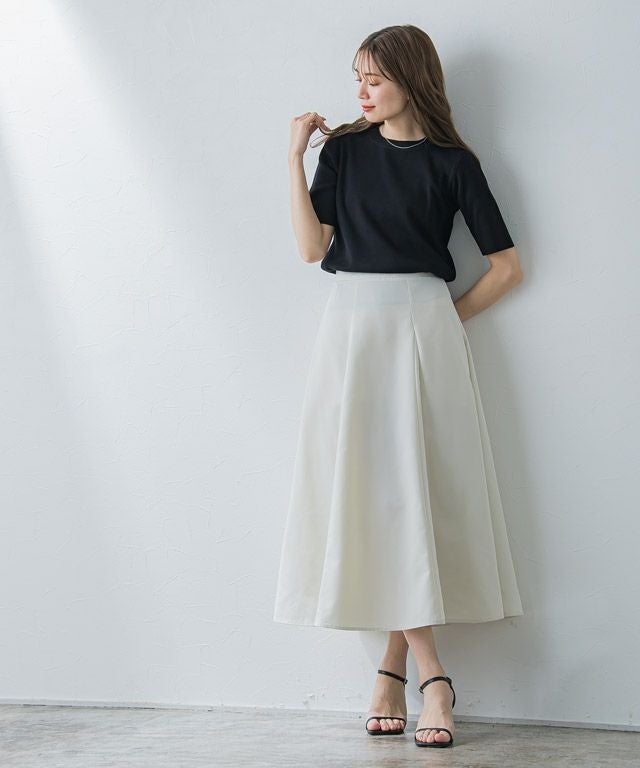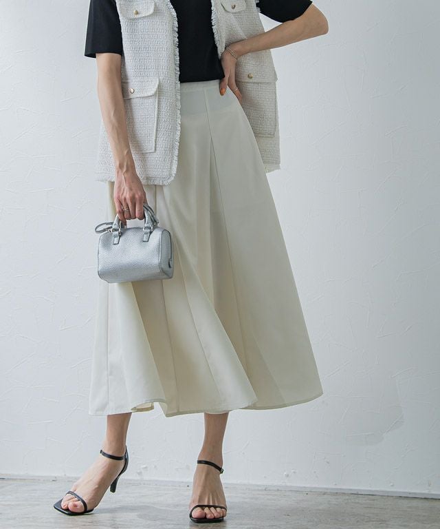 たっぷりと用尺をとり、ボリューム感を出したスカート。動くたびに揺れ、女性らしい印象に導いてくれます。切り替えデザインがスタリングに程良いアクセントをプラスしてくれます。
